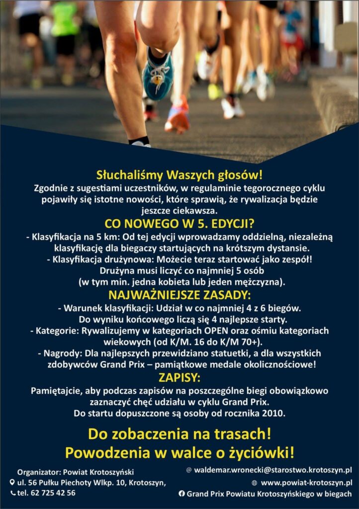 Cykl Grand Prix Powiatu Krotoszyńskiego jest prowadzony od pięciu lat jako działanie mające zwiększać zainteresowanie aktywnością ruchową wśród mieszkańców powiatu, a od dwóch lat do udziału zapraszani są także biegacze spoza powiatu. Jak podkreślają organizatorzy, stąd pomysł na połączenie biegów w jedną spójną klasyfikację. W 2026 roku wprowadzono również szereg zmian w regulaminie.