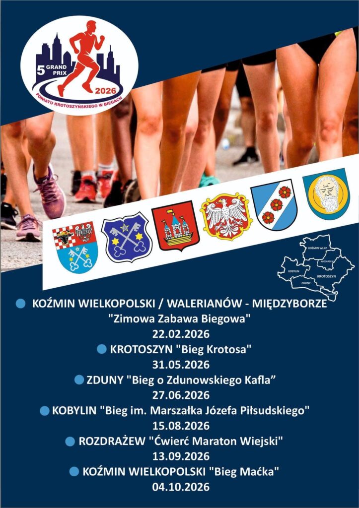 W tegorocznym kalendarzu zaplanowano sześć biegów: „Zimową Zabawę Biegową” (Walerianów–Międzyborze, 22.02.2026), „Bieg Krotosa” (Krotoszyn, 31.05.2026), „Bieg o Zdunowskiego Kafla” (gmina Zduny, 27.06.2026), „Bieg im. Marszałka Józefa Piłsudskiego” (gmina Kobylin, 15.08.2026), „Ćwierć Maraton Wiejski” (gmina Rozdrażew, 13.09.2026) oraz „Bieg Maćka” (Koźmin Wielkopolski, 04.10.2026).
