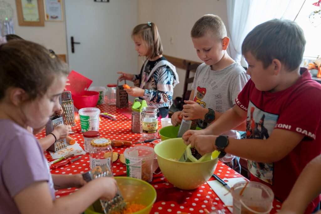 Kolejnym etapem wizyty było samodzielne wykonanie surówki z młodej, kiszonej kapusty, marchewki, jabłka oraz oleju i miodu. – Byliśmy dumni z naszych uczestników, którzy z łatwością radzili sobie z nożem, obieraczką do warzyw oraz tarką! Pani Emilia wiele razy podkreślała, że dzieci z gminy Krośnice mają ogromną wiedzę na temat upraw, warzyw i owoców. Po przygotowaniu swoich przetworów udaliśmy się na pole, gdzie mieliśmy możliwość nazbierać niezliczoną ilość ogórków. Podglądnęliśmy uprawę kapusty włoskiej, kapusty czerwonej oraz marchewki. Wiemy już teraz, że jesienią musimy odwiedzić to miejsce ponownie! Możemy się pochwalić, że nasza grupa zdobyła złoty medal półkolonii, a każdy z uczestników tytuł Kiszonkowych Masterchefów! Dziękujemy gospodarstwu Kiszonki Sznajderów z Doliny Baryczy za fantastyczne warsztaty! Pragniemy również podziękować Panu Łukaszowi, który wspólnie został okrzyknięty strongmanem za dźwiganie naszych zbiorów! – czytamy w relacji CETS w Krośnicach.