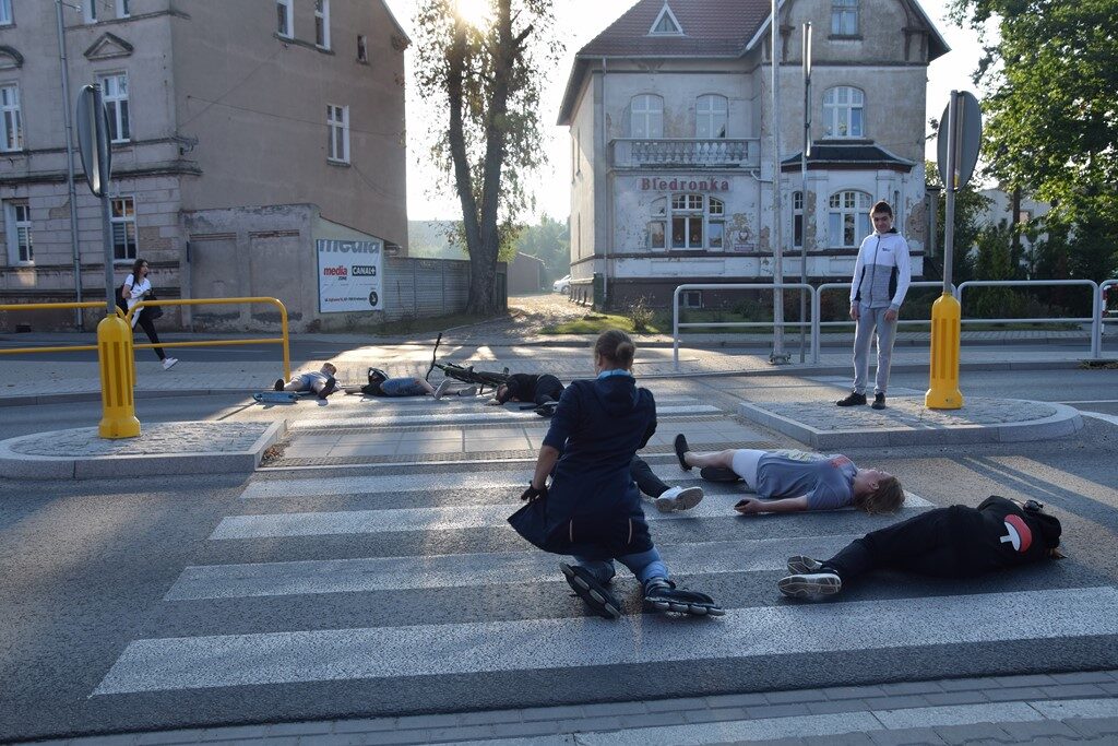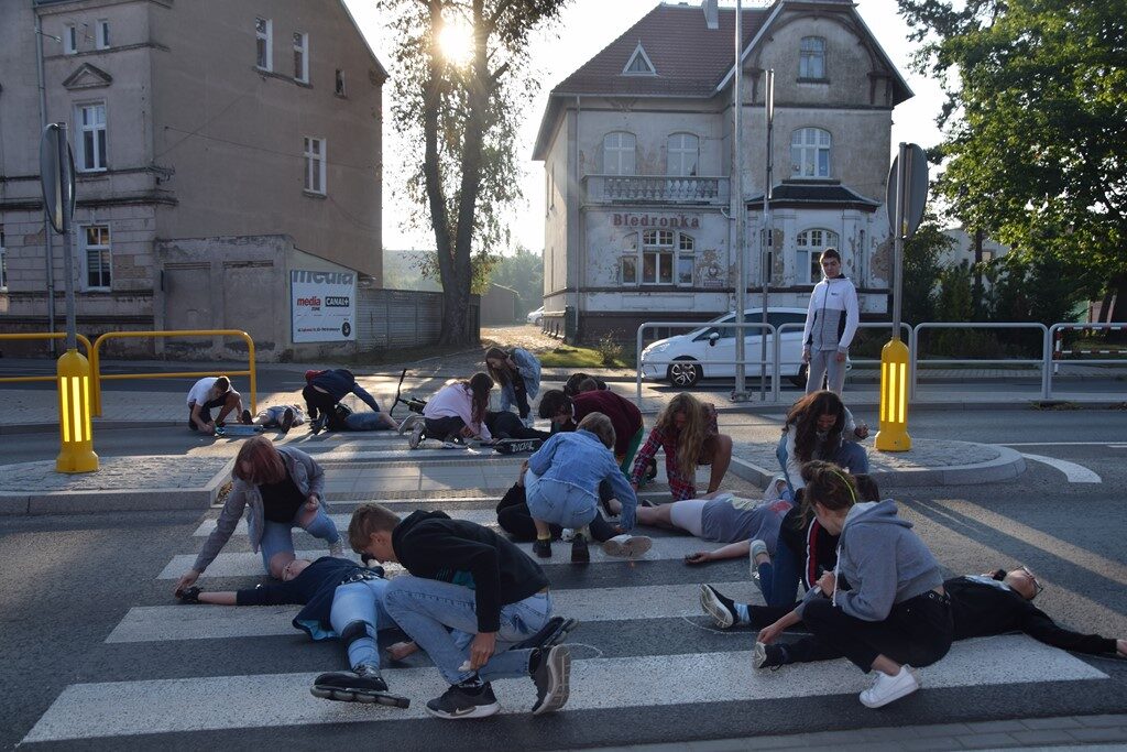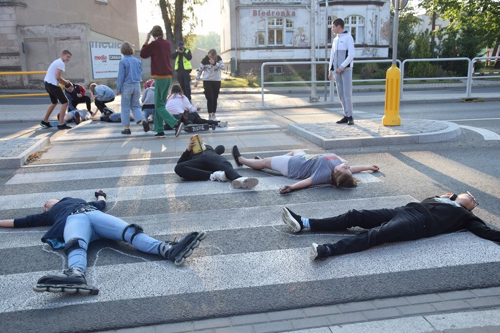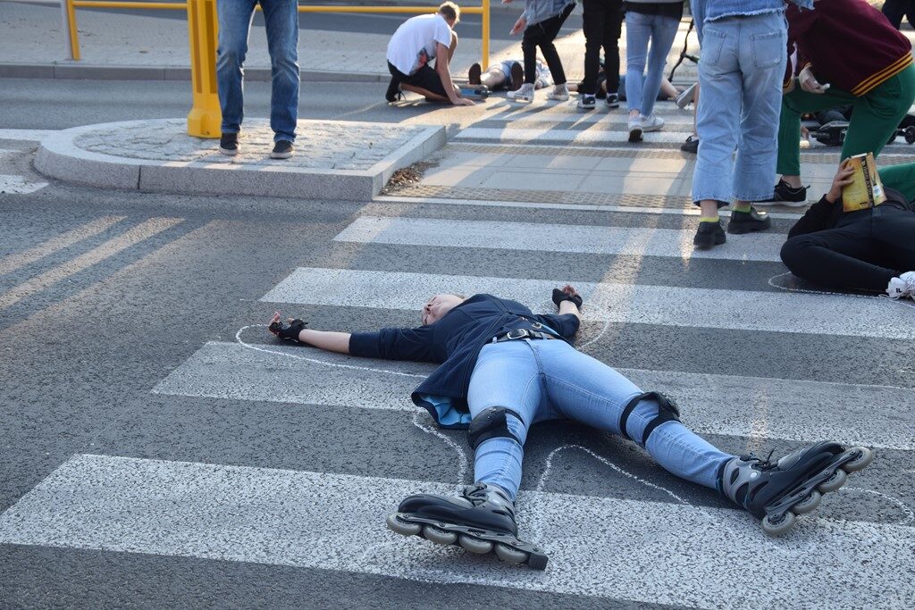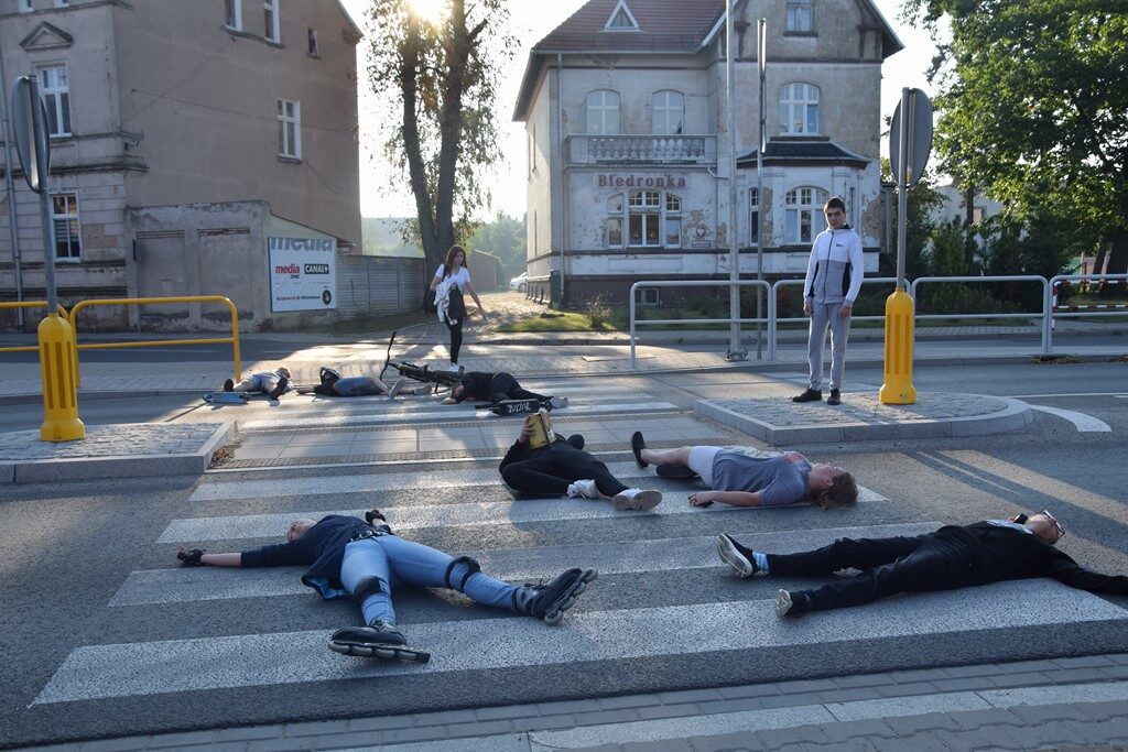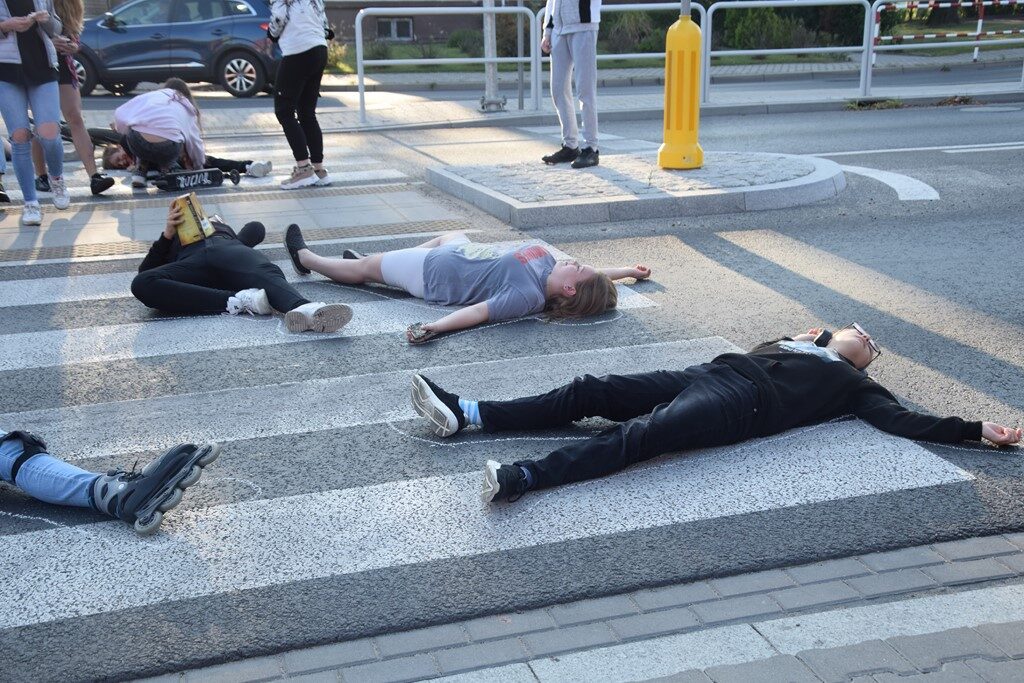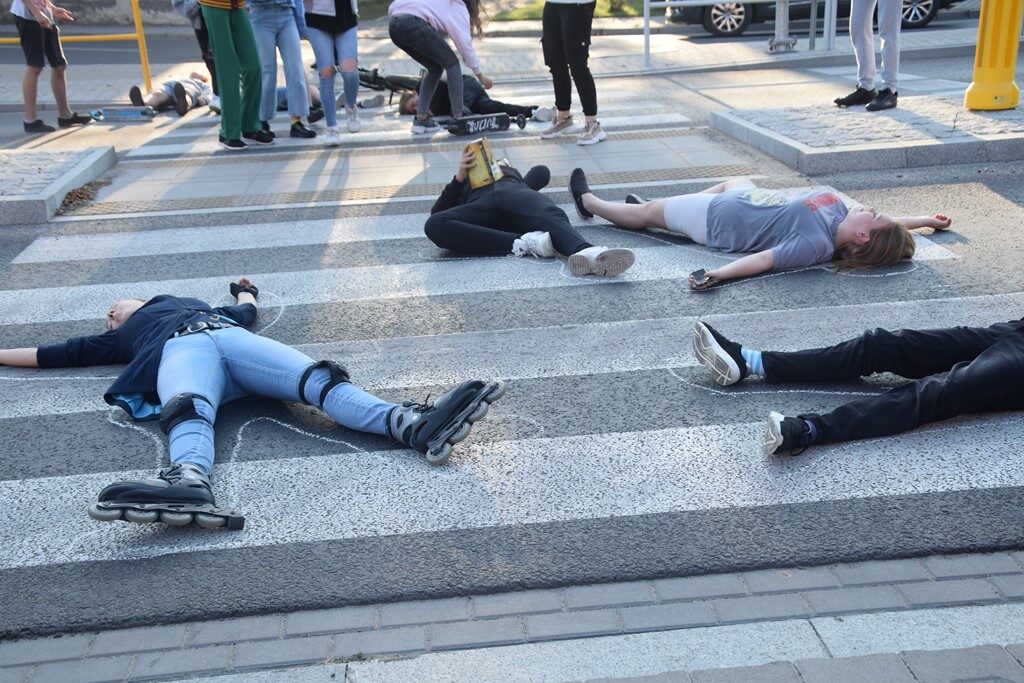 Akcja została zorganizowana dzięki współpracy Niepublicznej Szkoły Podstawowej w Krotoszynie, Komendy Powiatowej Policji oraz Urzędu Miejskiego w Krotoszynie. W pierwszym z sześciu zaplanowanych na ten rok szkolny performance’ów wzięli udział uczniowie klas VIIIa i VIIIb. Tuż po godzinie 8.00 funkcjonariusze krotoszyńskiej policji wstrzymali na kilka minut ruch na ul. Zdunowskiej. W tym czasie, na sygnał gwizdka, młodzież wjechała na rowerach, rolkach czy hulajnodze bądź weszła na pasy z różnymi przedmiotami, takimi jak telefon komórkowy czy książka. Uczniowie upadli na przejściu, a ich koleżanki i koledzy obrysowali ich sylwetki kredą.