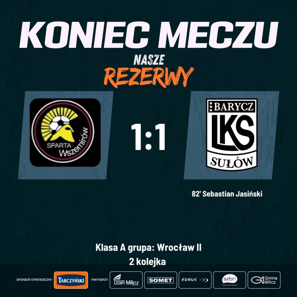 W drugiej kolejce A-klasy Barycz II Sułów zremisowała na wyjeździe ze Spartą Wszemirów 1:1. Mecz rozgrywany był w bardzo trudnych warunkach atmosferycznych – silny wiatr i ulewny deszcz utrudniały grę obu zespołom.