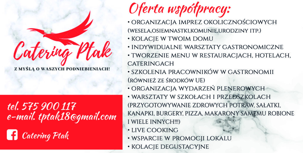 Postanowił zatem otworzyć catering połączony z działalnością consultingową i szkoleniową. – Taki typ firmy nie zajmuje mi całego tygodnia, dlatego mogę swobodnie łączyć organizację imprez okolicznościowych, warsztaty w szkołach, przedszkolach i prywatnych domach, tworzenie nowych kart czy pomoc w usprawnieniu pracy załogi w kuchni z życiem rodzinnym – podkreśla T. Ptak.