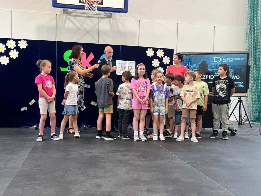 W poniedziałek, 23 czerwca 2025 roku, w Szkole Podstawowej w Kuźnicy Czeszyckiej odbył się uroczysty apel, podsumowujący działania w ramach Szkolnej Kasy Oszczędności. W wydarzeniu wzięli udział przedstawiciele Banku Spółdzielczego w Miliczu – dyrektor oddziału w Krośnicach -Roman Kowalczyk, doradca klienta – Agnieszka Boguś oraz koordynatorka konkursu SKO – Magdalena Fortuniak.