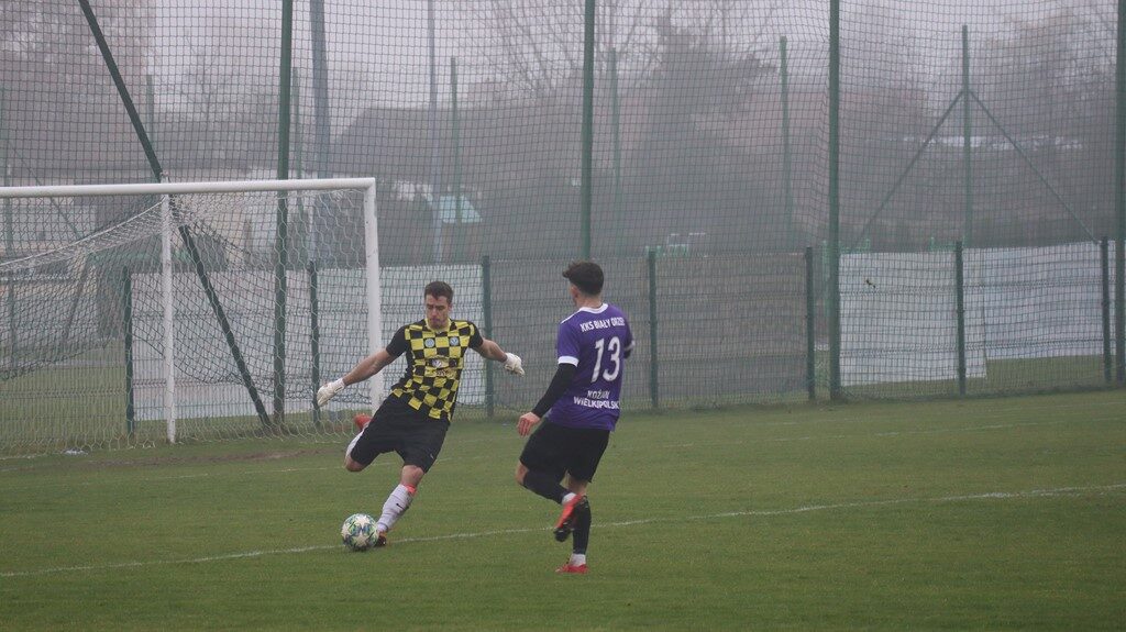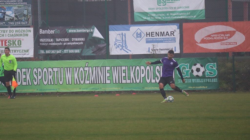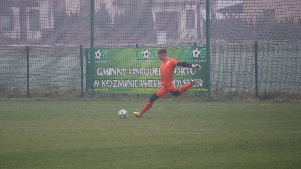W początkowych fragmentach spotkania koźminianie byli nieco bardziej aktywni i częściej gościli na połowie rywali. Mimo tego to przyjezdni otworzyli wynik meczu. W 16. minucie koźmińskiego golkipera pokonał Patryk Słomczyński. Gospodarze chcieli szybko odpowiedzieć. Najpierw z rzutu wolnego groźnie uderzał Krzysztof Czabański, ale bramkarz ze Śremu nie dał się zaskoczyć. Później po podaniu Filipa Oleśkowa głową strzelał Wojciech Kamiński, lecz piłka poszybowała nad poprzeczką. W 30. minucie miejscowi dopięli swego. Alan Janowski sfinalizował akcję zespołu, posyłając piłkę do pustej bramki.