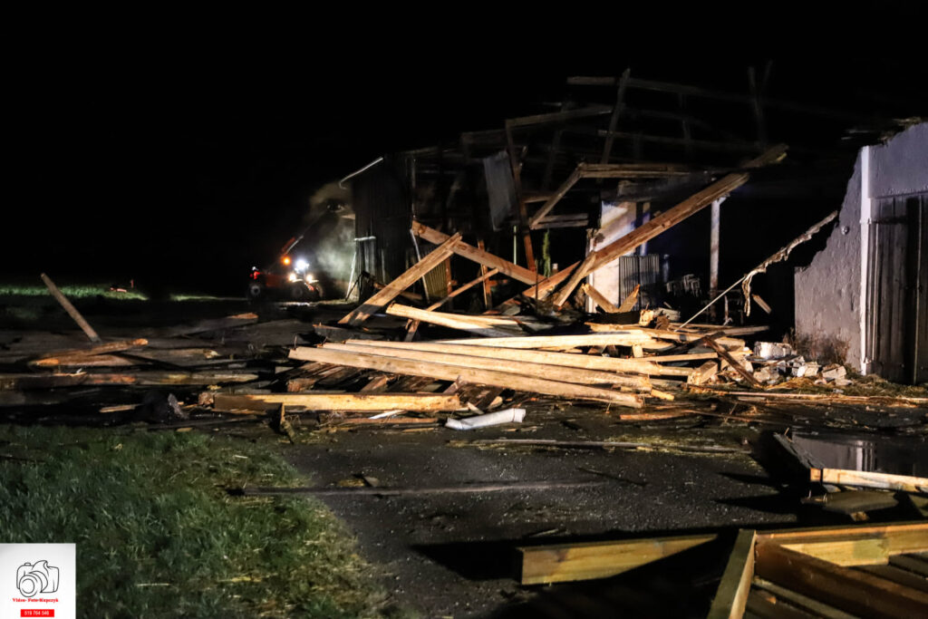 Pół godziny po pierwszym zdarzeniu porywy wiatru uszkodziły stodołę w miejscowości Smolice (gmina Kobylin). Na miejsce skierowano dwa zastępy z OSP Kobylin i jeden z miejscowej jednostki OSP. Wiatr zerwał dach i szczyt drewnianej stodoły. Drewniane elementy konstrukcyjne leżały na drodze, blokując ruch w obu kierunkach. – Po zabezpieczeniu i oświetleniu miejsca działań strażacy przystąpili do usuwania z jezdni drewnianej konstrukcji stodoły oraz poszycia dachowego, używając do tego pił mechanicznych do drewna i podręcznego sprzętu burzącego – mówi T. Patryas.