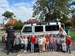 Najmłodsi mieli także okazję zasiąść za kierownicą policyjnego radiowozu i zapoznać się ze sprzętem wykorzystywanym przez funkcjonariuszy podczas służby. Policjant przekazał dzieciom również wskazówki, co należy zrobić, aby w przyszłości zostać policjantem.