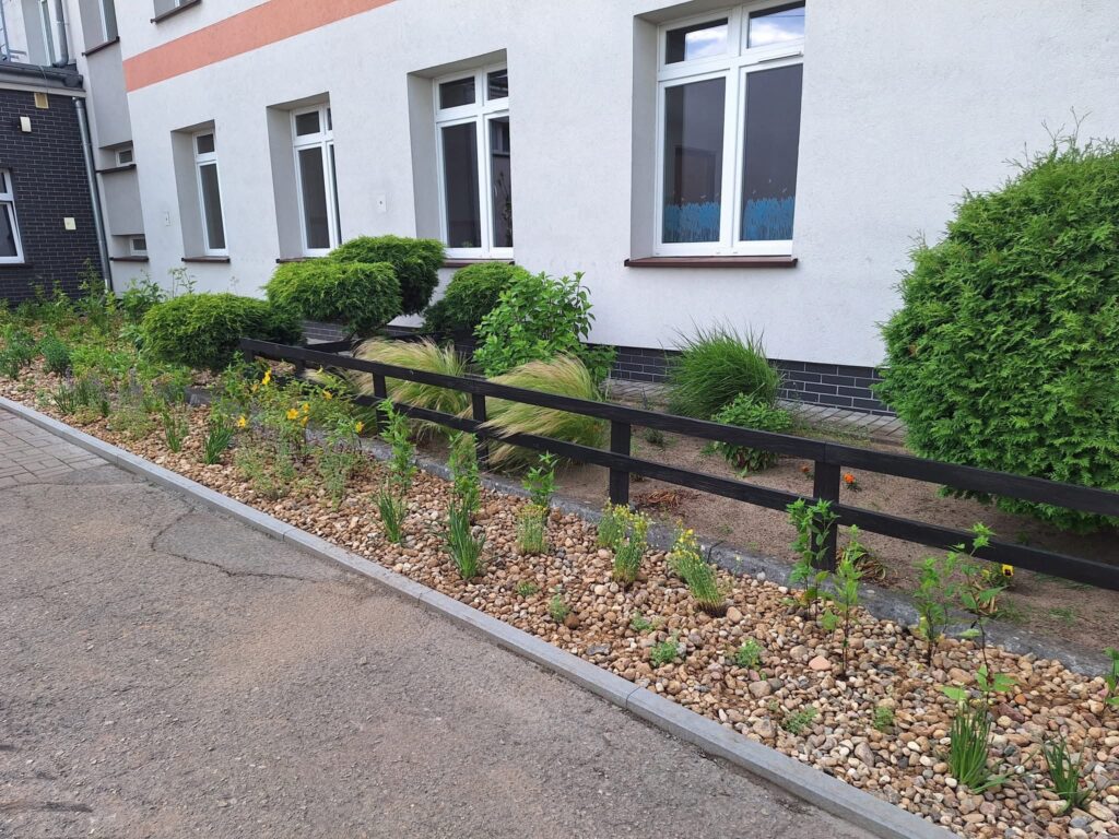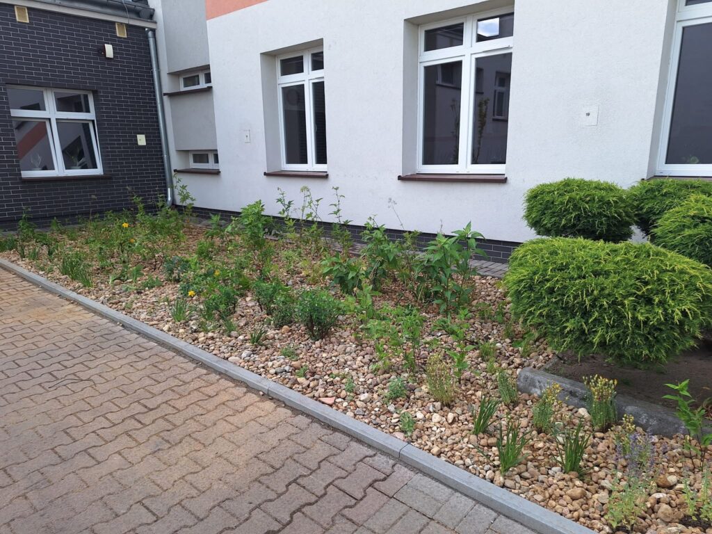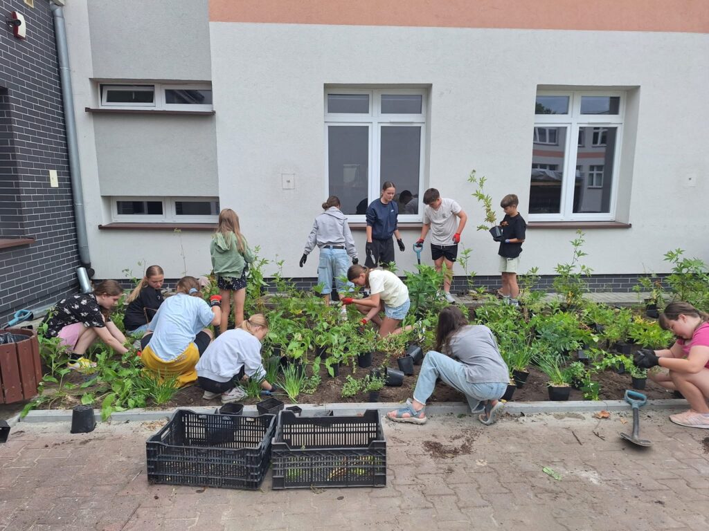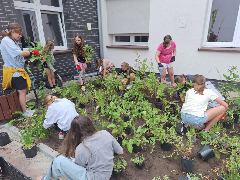 Ogród będzie zbierał wodę opadową z daszku przed wejściem do szkoły. Uczniowie, nauczyciele i pracownicy firmy Ledum wspólnie wykonali nasadzenia roślin i bylin, które pozwolą zatrzymywać i wykorzystywać deszczówkę w sposób naturalny.