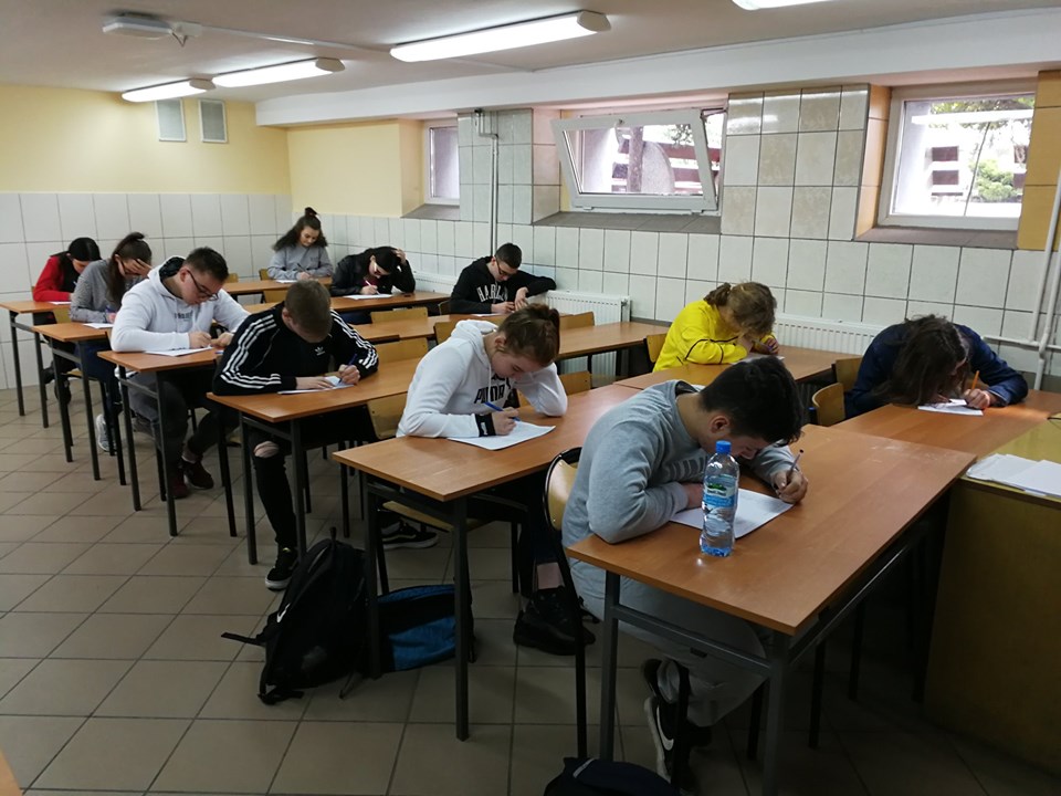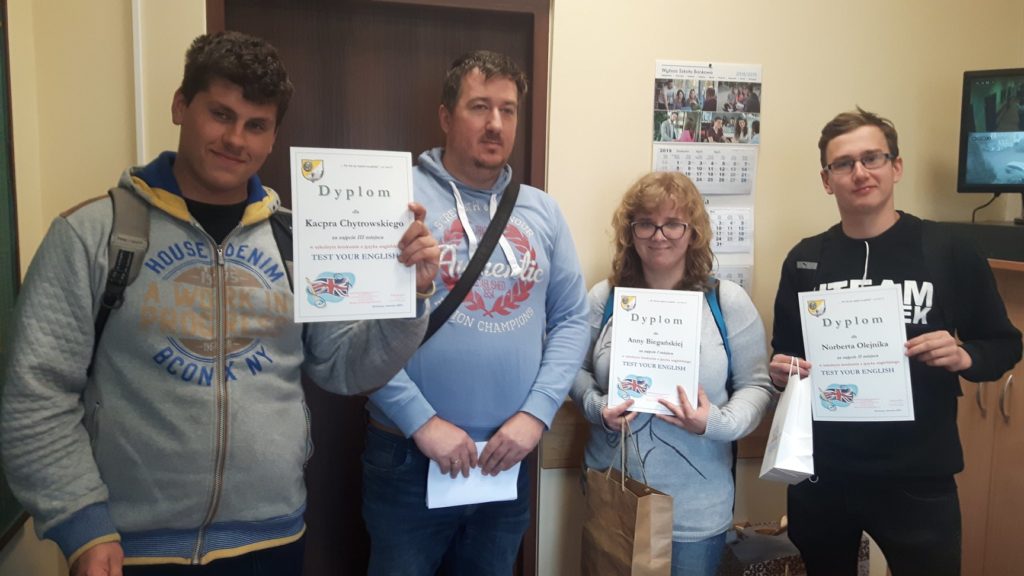 Konkurs z języka angielskiego koordynował Robert Grobelny. Uczniowie musieli uporać się z testem z pytaniami zamkniętymi o zróżnicowanym poziomie trudności. Najlepiej poradziła sobie Anna Biegańska (42 pkt.), a kolejne miejsca zajęli Norbert Olejnik (40 pkt.) i Kacper Chytrowski (36 pkt.).