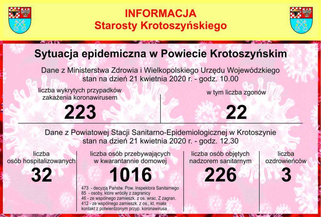 Są to mężczyźni w wieku 29, 53 i 63 lat. Wszyscy zostali objęci izolacją domową. Do tej pory badania potwierdziły obecność wirusa SARS-CoV-2 u 223 mieszkańców powiatu krotoszyńskiego. Niestety, 22 osoby zmarły.