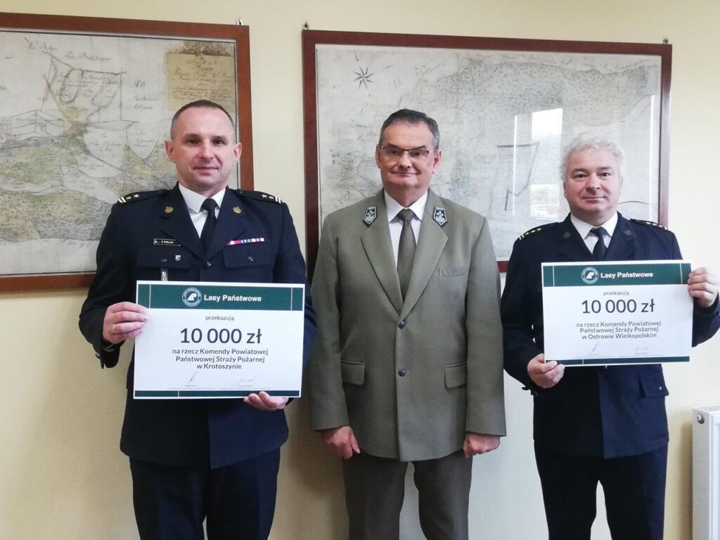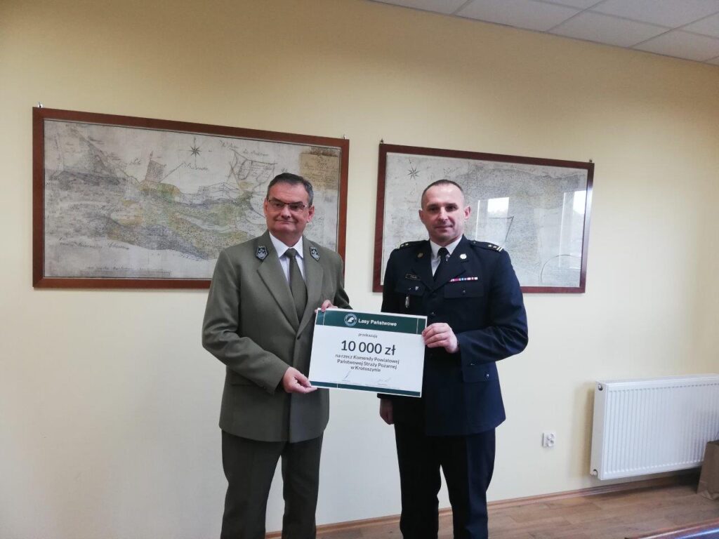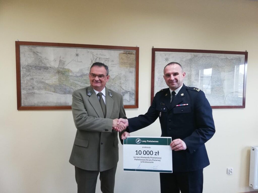 Komendant powiatowy Państwowej Straży Pożarnej w Krotoszynie bryg. Tomasz Polak otrzymał z rąk nadleśniczego Wiesława Bulińskiego symboliczny czek o wartości 10 tysięcy złotych. Przekazane przez Lasy Państwowe środki zostaną wykorzystane na doposażenie krotoszyńskiej komendy w urządzenia łączności oraz sprzęt ratownictwa medycznego.
