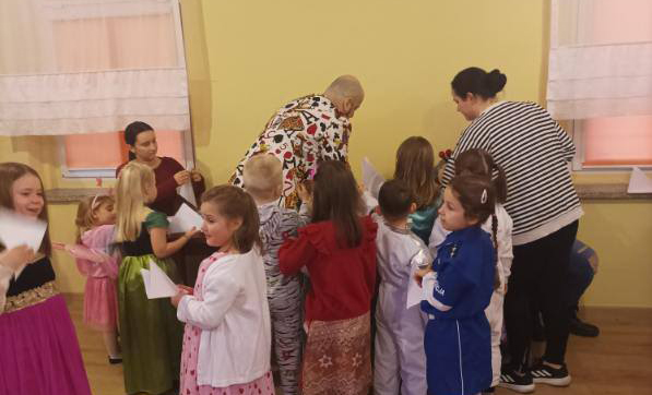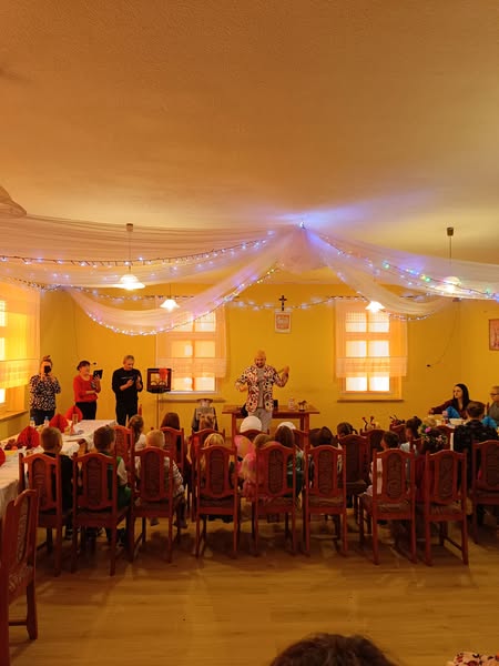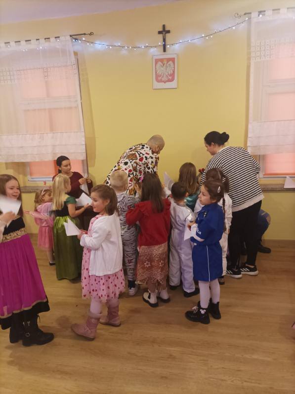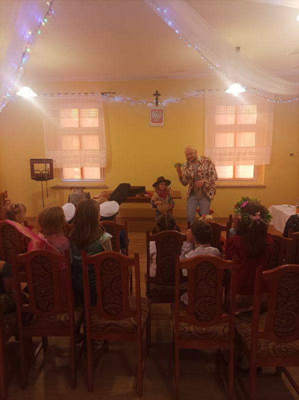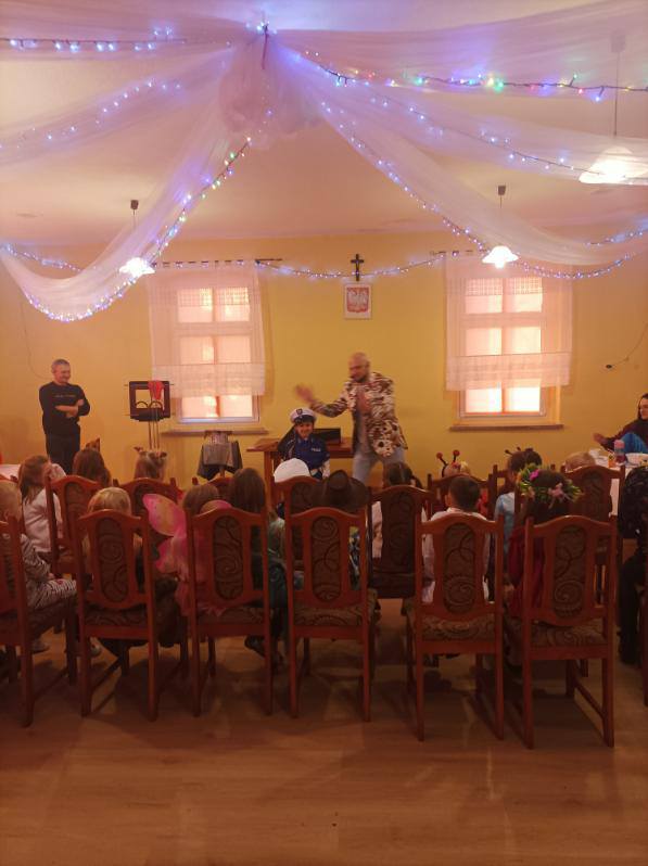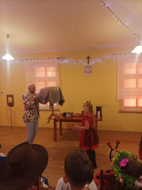 Jedną z głównych atrakcji balu był występ magika, który zachwycił dzieci swoim pokazem czarów i iluzji. Mali uczestnicy z zapartym tchem obserwowali magiczne sztuczki, które wzbudziły wiele radości i zachwytu.
