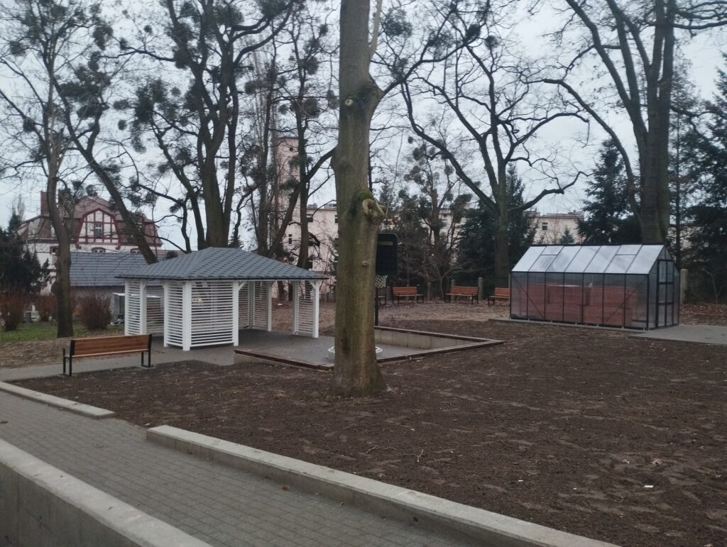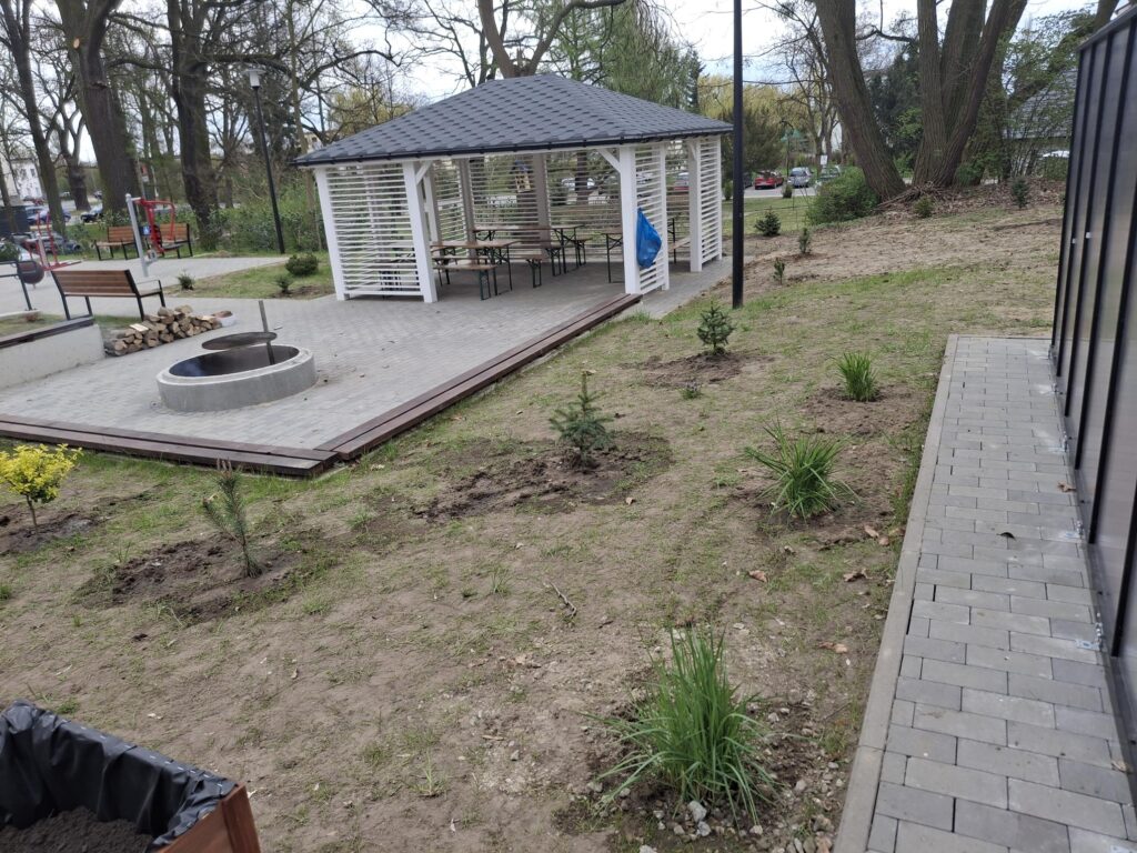 Na zewnątrz przeprowadzono termomodernizację ścian oraz stworzono zupełnie nową przestrzeń rekreacyjną. Pojawiła się tam zewnętrzna siłownia, są nowe trawniki, nasadzono drzewa i krzewy. Dodatkowo dla lepszej funkcjonalności dodano altanę, ławki, szklarnię, skrzynie do uprawy roślin oraz nowoczesne oświetlenie.