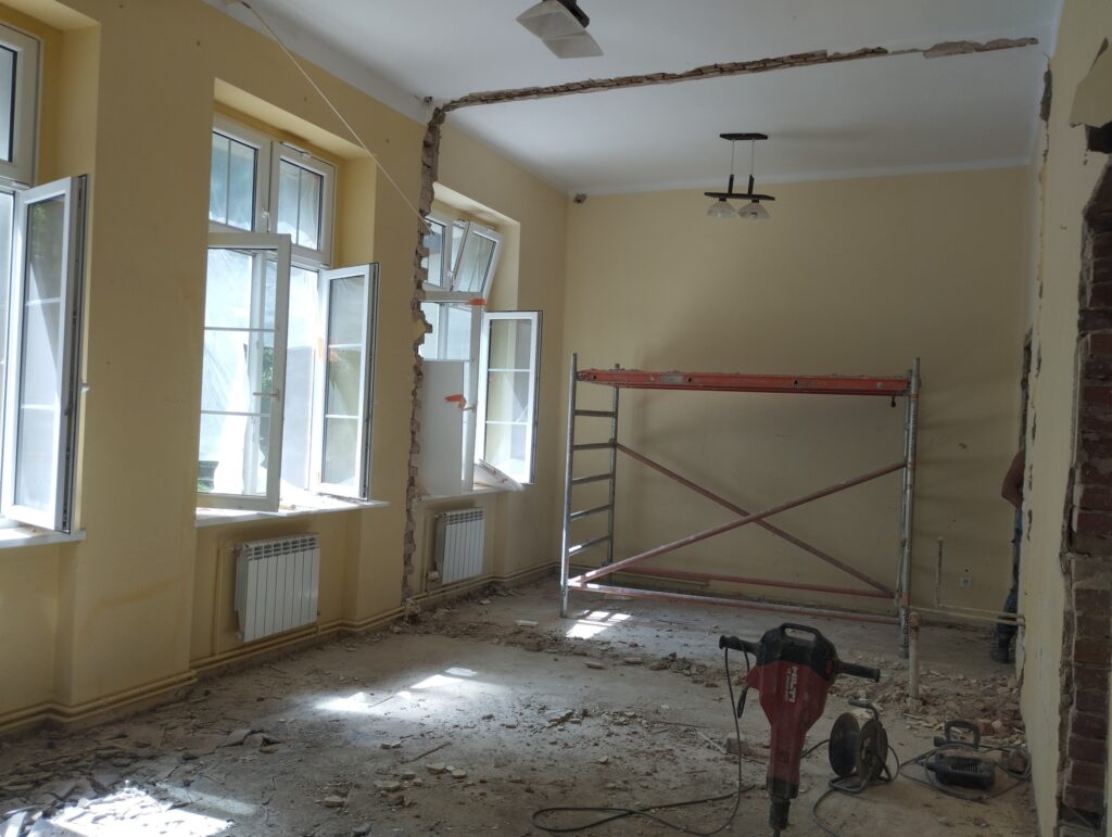 Wnętrze budynku również uległo przemianie dzięki częściowej modernizacji oraz adaptacji pomieszczeń. Zakupiono nowe materiały instalacyjne i wyposażenie użytkowe, aby lepiej dostosować obiekt do potrzeb osób z niepełnosprawnościami.