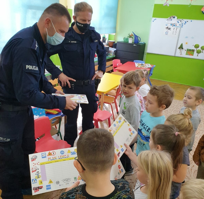 Do przedszkola zawitali młodszy aspirant Przemysław Jarecki i sierżant sztabowy Jacek Jarosz. Maluchy dowiedziały się m.in. jak prawidłowo i bezpiecznie poruszać się po drogach, jak bezpiecznie przejść przez ulicę oraz jak ważne jest używanie elementów odblaskowych, które są widoczne z daleka i znacznie zwiększają bezpieczeństwo pieszych poruszających się po zmroku.