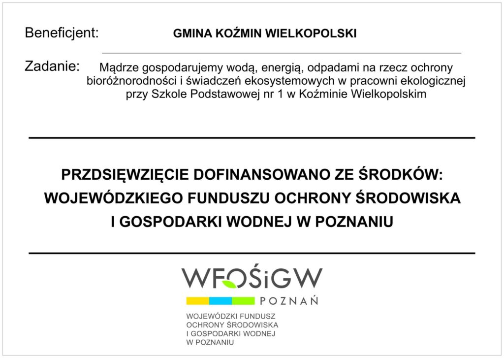 Przy Szkole Podstawowej nr 1 w Koźminie Wielkopolskim powstała nowa pracownia ekologiczna, utworzona w ramach projektu „Mądrze gospodarujemy wodą, energią, odpadami na rzecz ochrony bioróżnorodności i świadczeń ekosystemowych w pracowni ekologicznej przy Szkole Podstawowej nr 1 w Koźminie Wielkopolskim”. Całkowity koszt przedsięwzięcia wyniósł 71.500,00 zł.