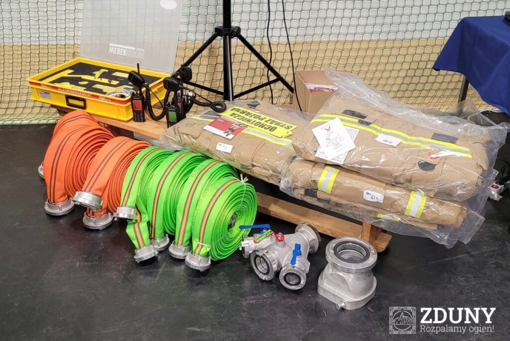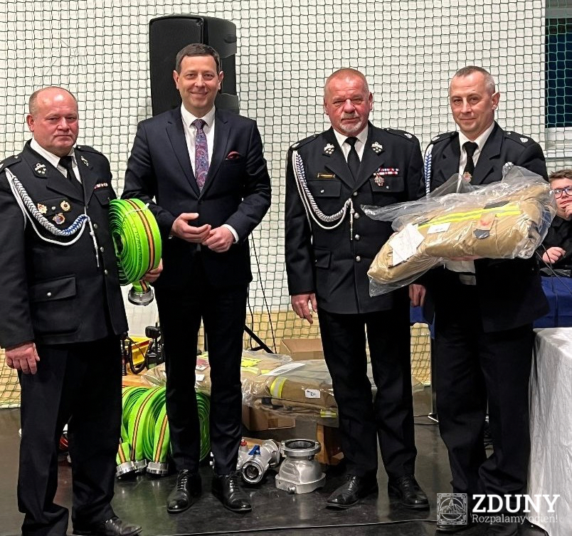 Podczas zebrania burmistrz Zdun wręczył strażakom przęt zakupiony w ramach dotacji z programu Ochrony Ludności i Obrony Cywilnej na lata 2025-2026, w tym radiotelefon samochodowy Motorola R7 i 3 sztuki ubrań specjalnych SX4 Gold na kwotę 14,8 tys. zł oraz zakupione ze środków gminy Zduny dwa radiotelefony przenośne Motorola R7 za kwotę 1 tys. 291 zł.