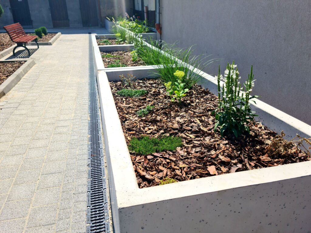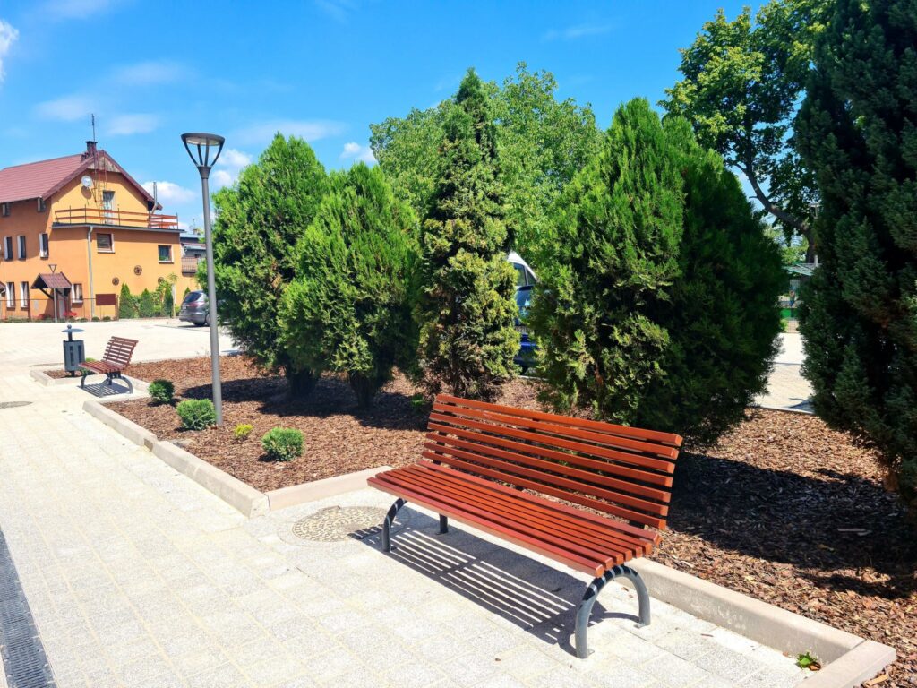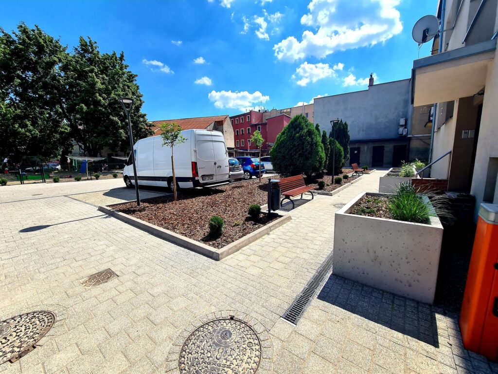 Dopełnieniem całości są nowe ławki, modernistyczne donice z kwiatami oraz rozmaite drzewka i krzewy.