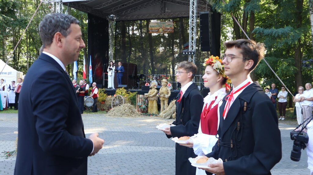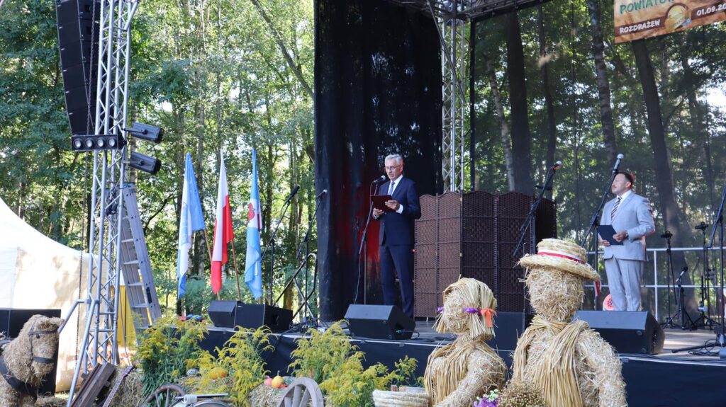 Wójt Rozdrażewa, Mariusz Dymarski, powitał wszystkich zgromadzonych gości, podkreślając znaczenie dożynek jako czasu refleksji nad trudami pracy rolników oraz wspólnej radości z jej owoców. Słowa uznania i wdzięczności skierował do rolników także starosta Paweł Radojewski, który zaznaczył, że ich codzienny trud jest fundamentem stabilności i dobrobytu lokalnej społeczności.