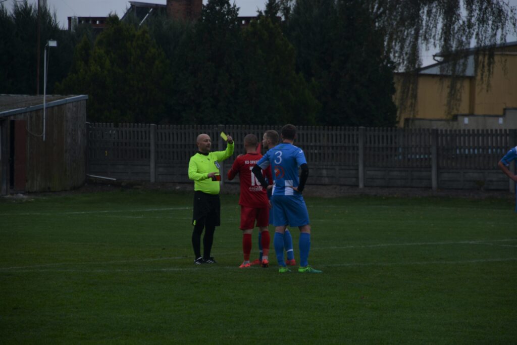 Od początku spotkania obie drużyny starały się stwarzać zagrożenie pod bramką rywala. Już w 11. minucie goście objęli prowadzenie za sprawą Łukasza Maciejewskiego. Niedługo potem współpraca Szymona Polowczyka i Kamila Czołnika przyniosła zamierzony efekt, ale sędzia odgwizdał pozycję spaloną. Pod koniec pierwszej odsłony pomiędzy zawodnikami wywiązała się szarpanina. Arbiter uspokoił graczy, upominając żółtą kartką po jednym piłkarzu z każdego zespołu.