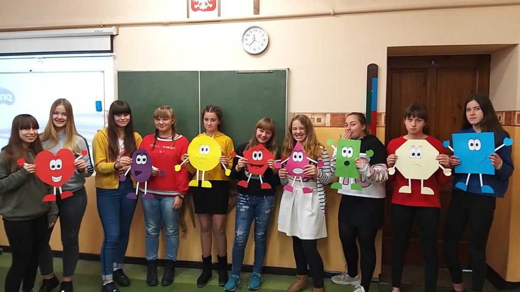 Uczniowie klasy VIIb przygotowali „Memory game” z emotikonami figur geometrycznych i zamieścili na nich nazwy uczuć w języku polskim oraz angielskim.