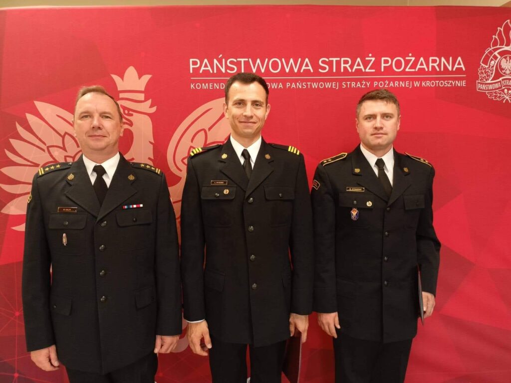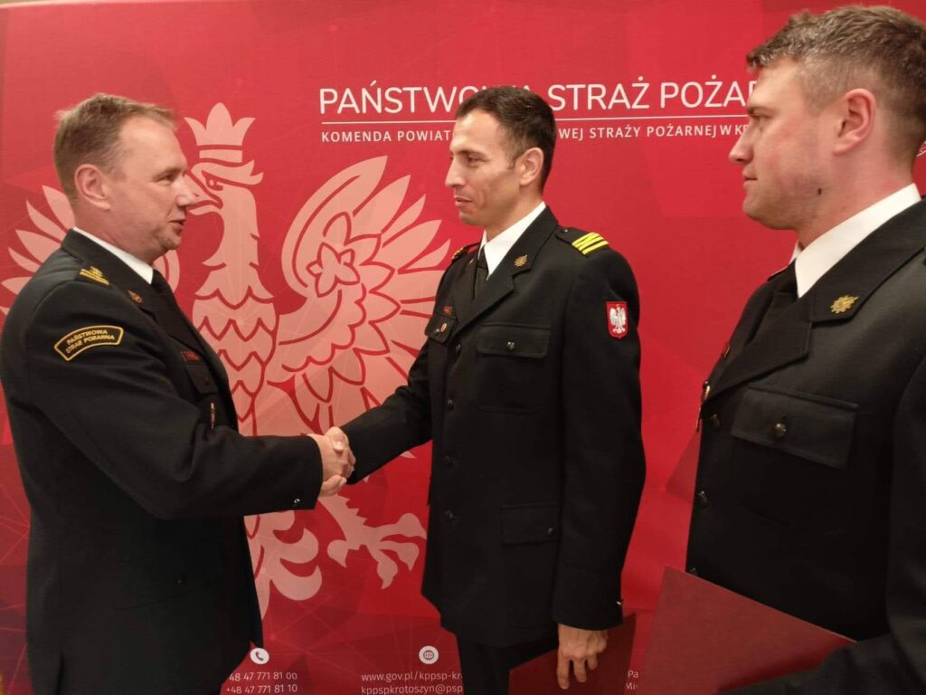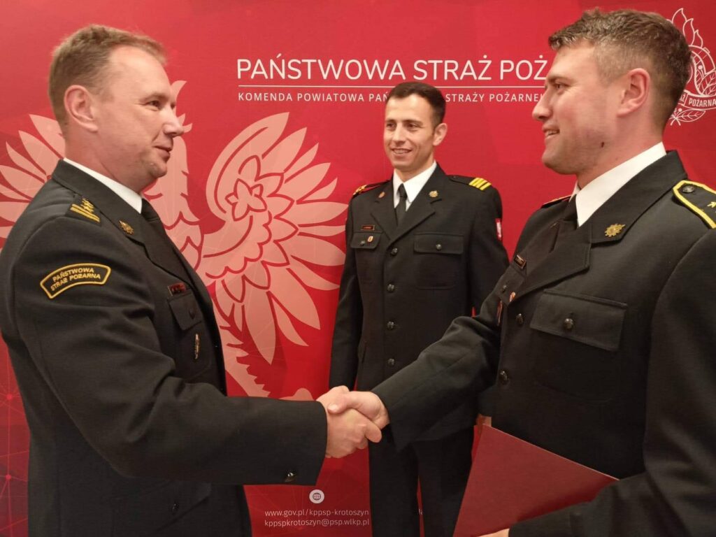 Dwóch krotoszyńskich strażaków poszerzyło swoje kwalifikacje. Gratulacje złożył im pełniący obowiązki komendanta KP PSP w Krotoszynie st. bryg. Marek Kalak.
