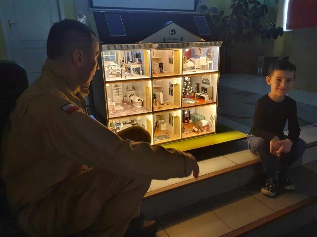 Elementarne zasady bezpieczeństwa, dostosowane do wieku słuchaczy, omówione zostały w oparciu o prezentację zagrożeń w domu jednorodzinnym przy wykorzystaniu mobilnego symulatora. Funkcjonariusz zwrócił dzieciom uwagę na zasady bezpiecznego wypoczynku w czasie wolnym od zajęć przedszkolnych oraz na inne zagrożenia wynikające z życia codziennego. Przedszkolaki miały również okazję poznać sposoby powiadamiania służb ratunkowych.