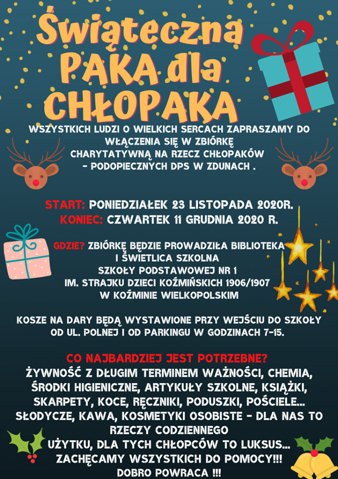 Koźmińska Jedynka postanowiła wesprzeć ośrodek, organizując akcję pod nazwą „Świąteczna Paka dla Chłopaka”. Jest to zbiórka na rzecz podopiecznych zdunowskiego DPS-u.