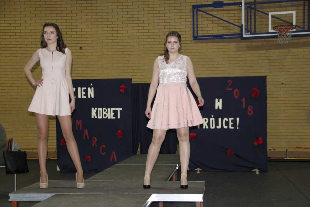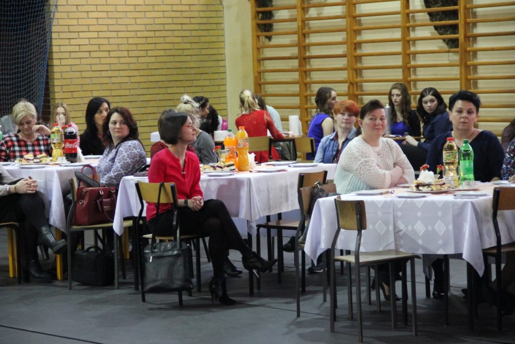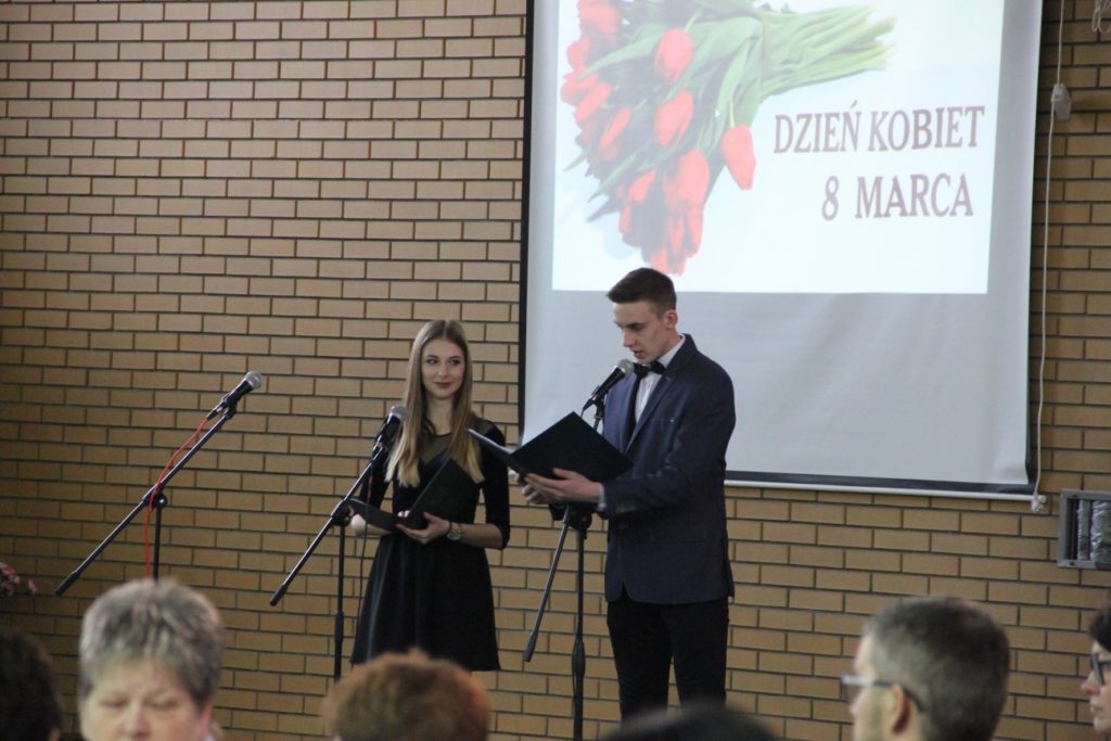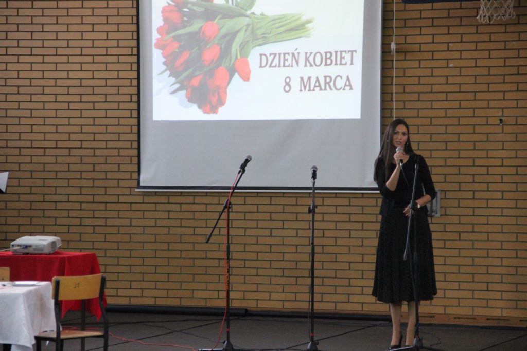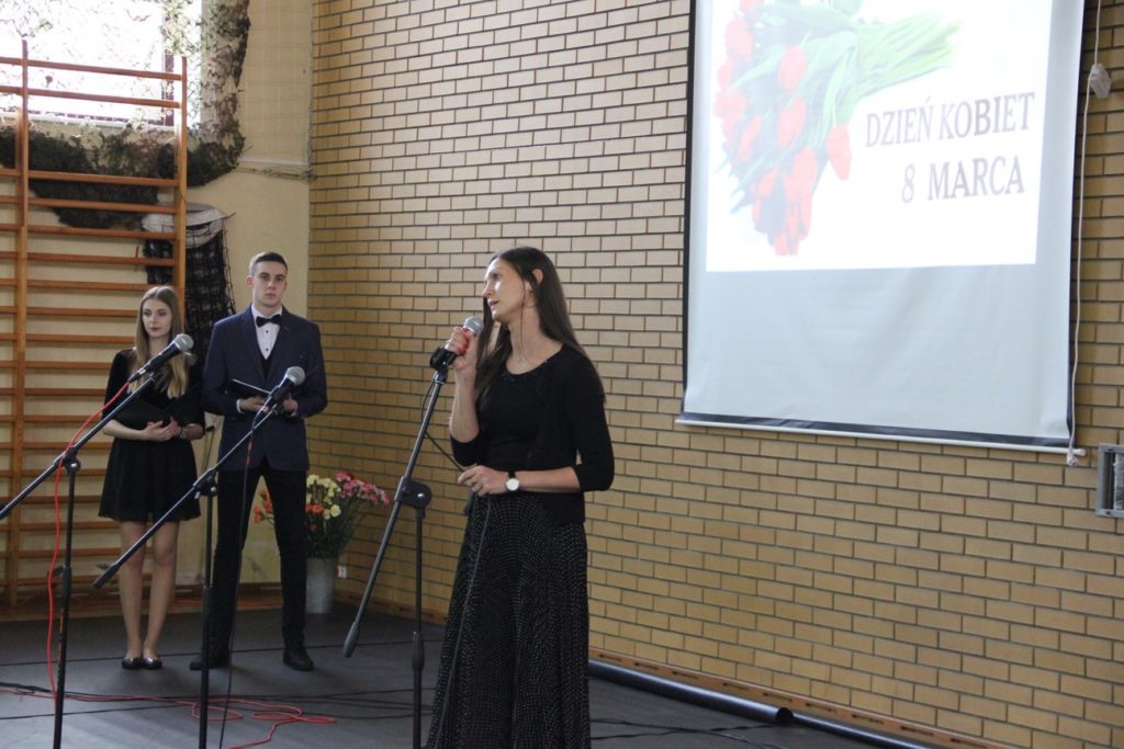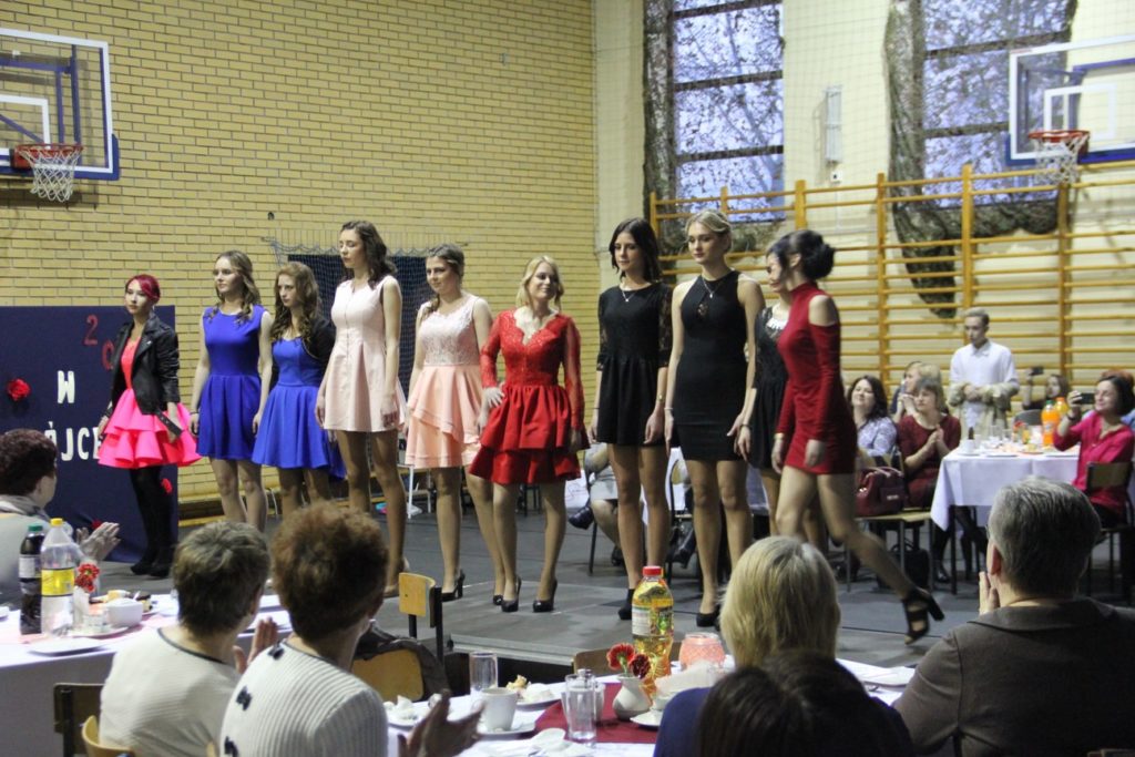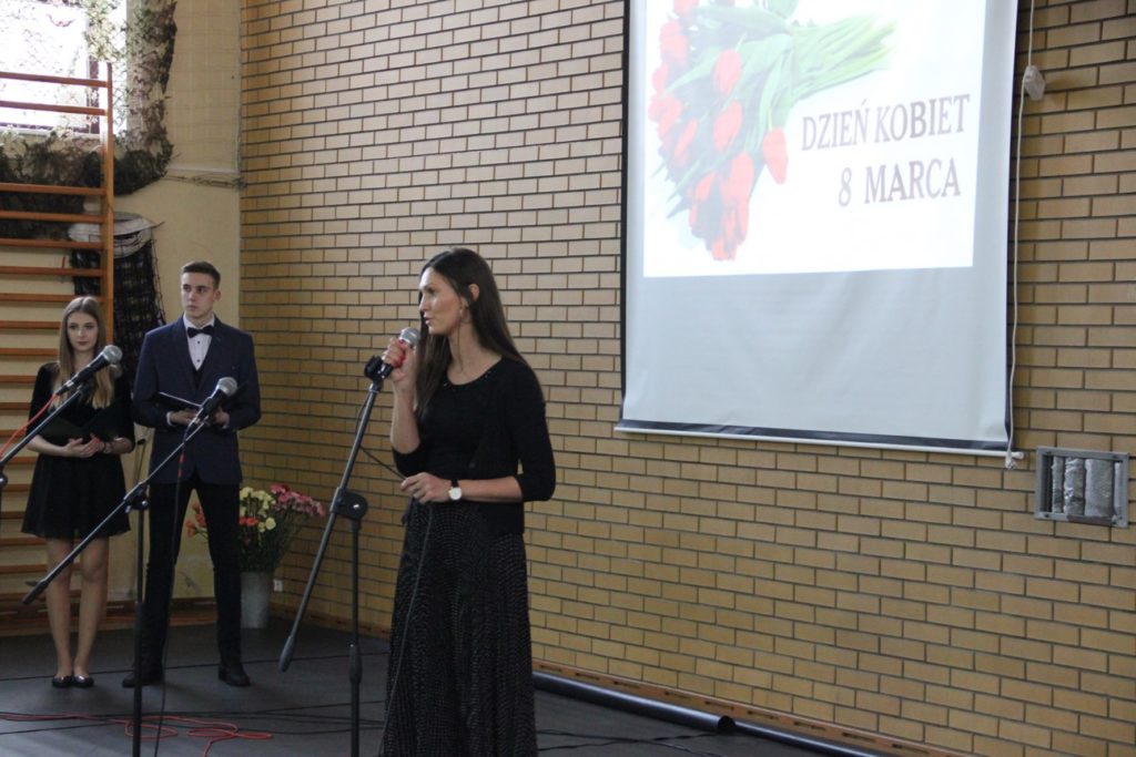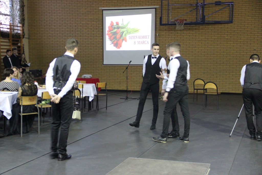 Imprezę rozpoczęła Izabela Kossakowska, dyrektor szkoły, która życzyła wszystkim paniom udanego wieczoru i wszelkiej pomyślności. Uczniowie przypomnieli historię święta oraz przedstawili sylwetki najbardziej znanych kobiet. Nie zabrakło fragmentów starych kronik z czasów PRL-u. Wszystkim paniom obowiązkowo wręczono legendarne czerwone goździki, co przypomniało dawne czasy. Tę część zwieńczył występ Gabrieli Siwek, która wykonała utwór „Gdzie ci mężczyźni”.