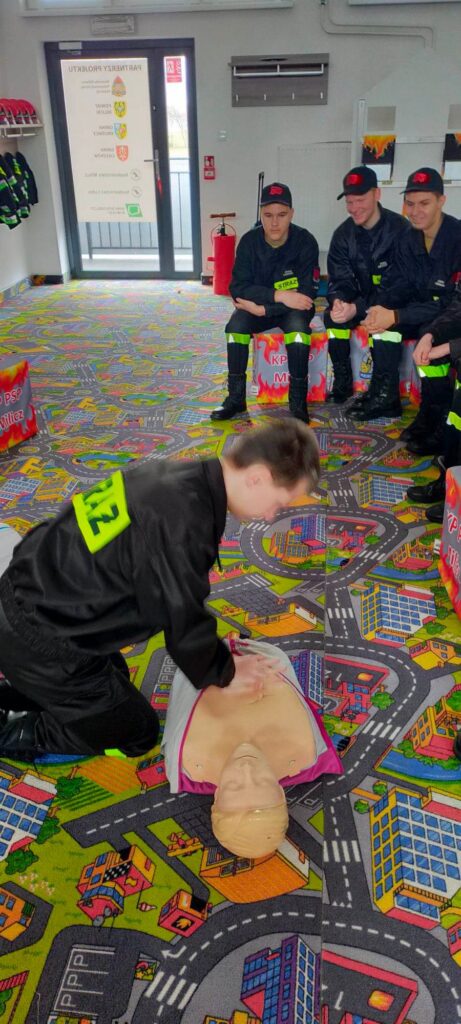 Komenda Powiatowa Państwowej Straży Pożarnej równolegle zorganizowała również zajęcia dla Ochotniczej Straży Pożarnej w Guzowicach. – Funkcjonariusz z naszej komendy, asp. Jędrzej Kaczmarek, prowadził zajęcia dla młodzieżowej drużyny pożarniczej, ucząc najmłodszych m.in. podstaw pierwszej pomocy, w tym resuscytacji krążeniowo-oddechowej, ułożenia poszkodowanego w pozycji bezpiecznej bocznej ustalonej czy współpracy z AED. Poza tym przeprowadził ogólną pogadankę odnośnie bezpieczeństwa, aby już tak młode pokolenie wiedziało, jak zachować się w sytuacjach kryzysowych – informuje KP PSP Milicz.