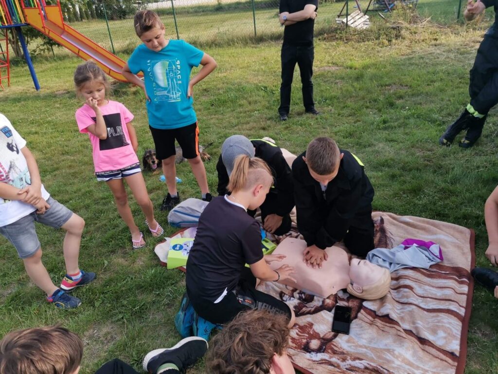 Funkcjonariusz Komendy Powiatowej Państwowej Straży Pożarnej w Miliczu, asp. Jędrzej Kaczmarek, poprowadził zajęcia edukacyjne dla młodzieżowych drużyn pożarniczych. Celem było doskonalenie umiejętności udzielania pierwszej pomocy i obsługi AED. Za pośrednictwem domku instruktażowego zaprezentowano procesy, jakie zachodzą podczas pożaru.