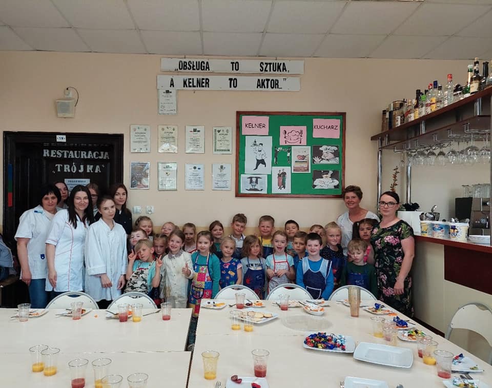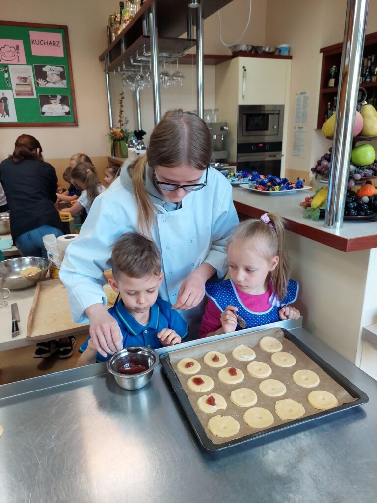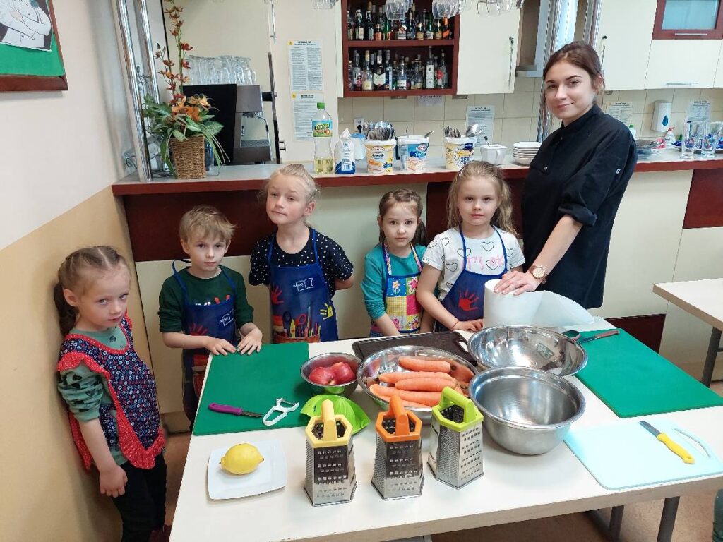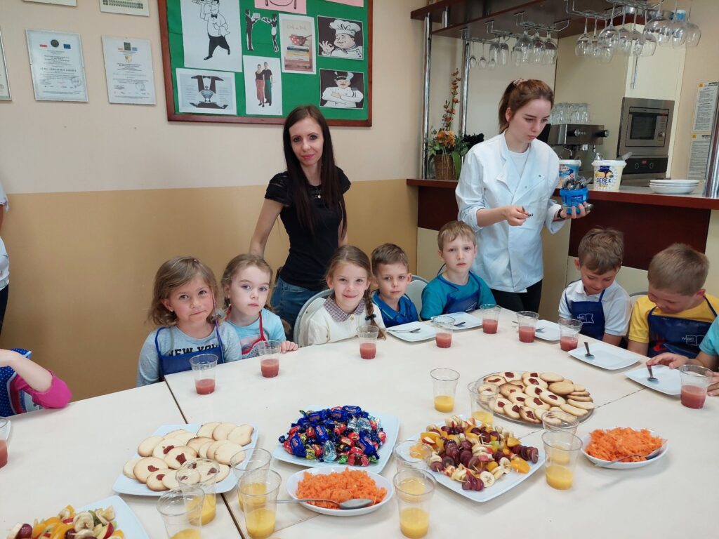 Tego samego dnia przyszli kucharze uczący się w ZSP nr 3 w Krotoszynie czuwali nad warsztatami kulinarnymi, w których uczestniczyły dzieci z Przedszkola „Słoneczko” w Krotoszynie. Uczniowie wykazali się kreatywnością w przygotowaniu dla przedszkolaków pełnowartościowych potraw. Wspólnie przyrządzono owocowe szaszłyki, surówkę z marchwi i jabłka, kruche ciasteczka, koktajl arbuzowy oraz smoothie egzotyczne. Po gotowaniu wszyscy wspólnie zasiedli do stołu, aby spróbować pyszności, które przygotowali.
