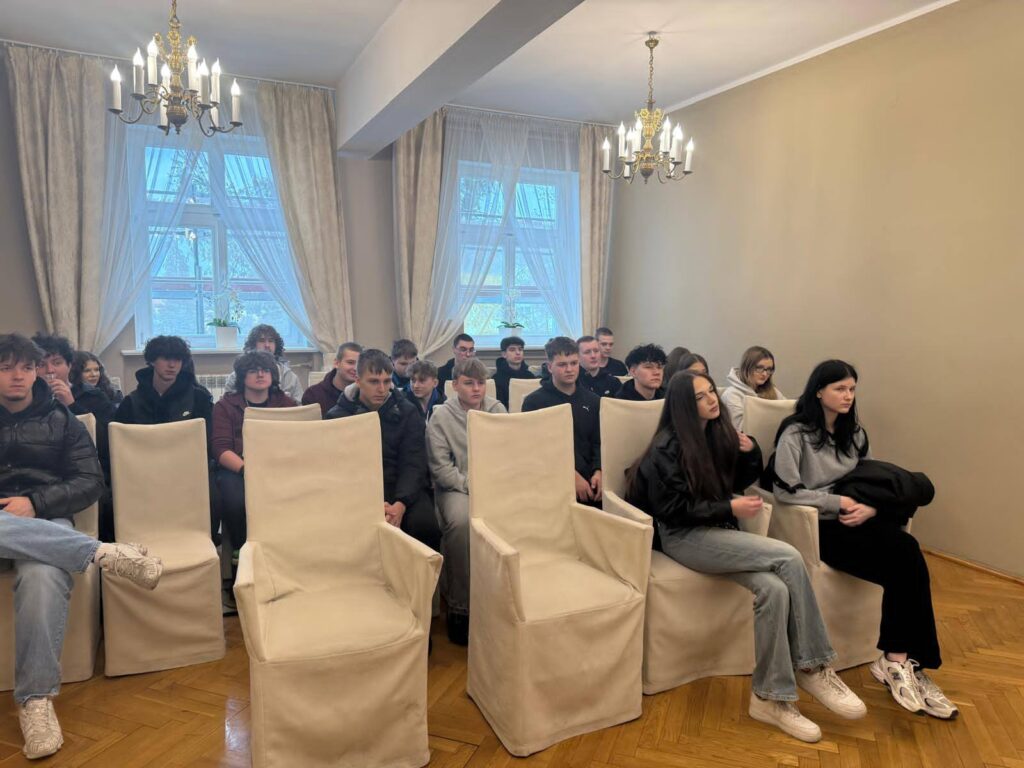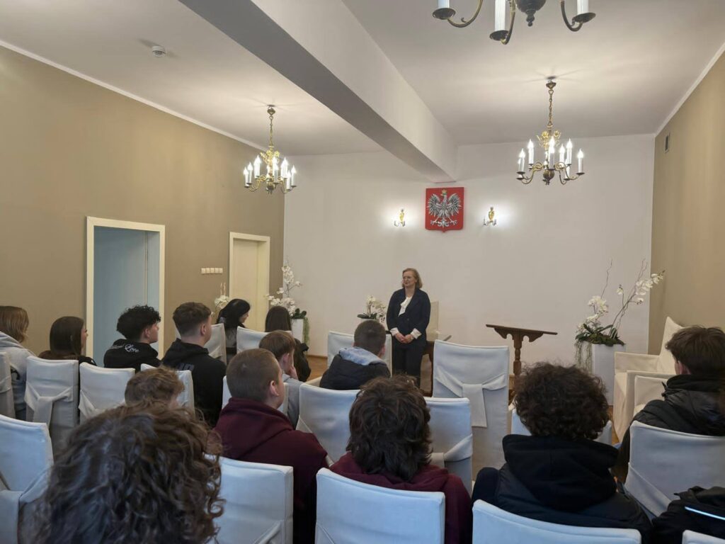 Kolejnym punktem wizyty była sala ślubów. Tam kierownik wydziału Danuta Pudłowska przybliżyła młodzieży kwestie związane z zawieraniem małżeństw, rejestracją dzieci, aktami urodzenia oraz zmianą nazwiska.
