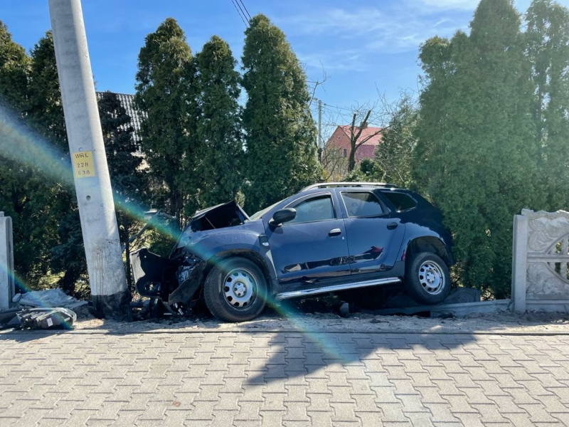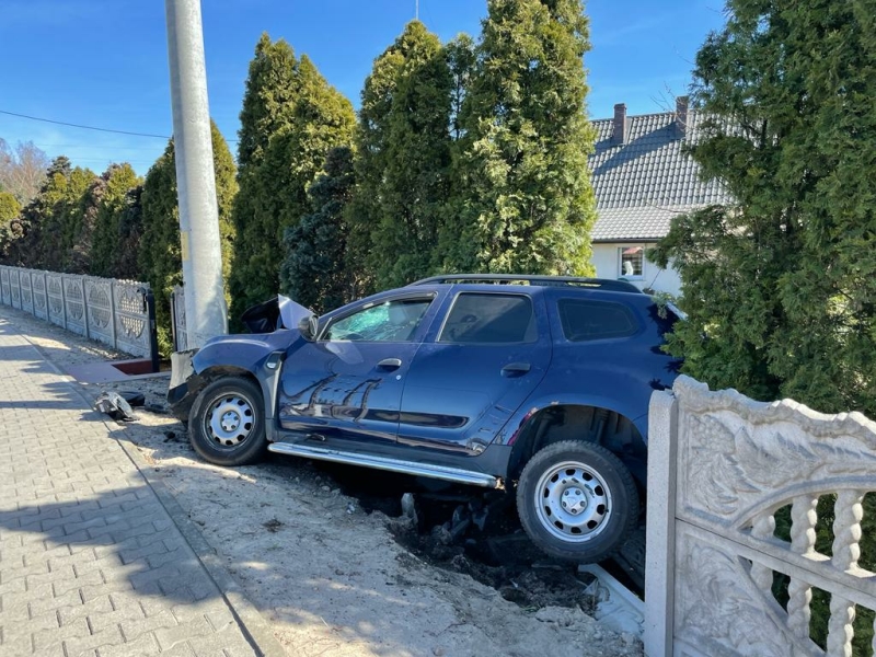 Samochodem osobowym marki Dacia Duster kierował 36-letni mieszkaniec Koźmina Wlkp. Wraz z nim podróżowała jeszcze jedna osoba. Na łuku drogi kierowca nie dostosował prędkości do panujących warunków, w wyniku czego stracił panowanie nad pojazdem, który zjechał na pobocze i z impetem uderzył w betonowy słup energetyczny oraz betonowe ogrodzenie posesji. Samochód uległ poważnemu uszkodzeniu i nie nadawał się do dalszej jazdy. Zniszczone zostały także przęsła ogrodzenia, a słup linii energetycznej nieznacznie skrzywiony.