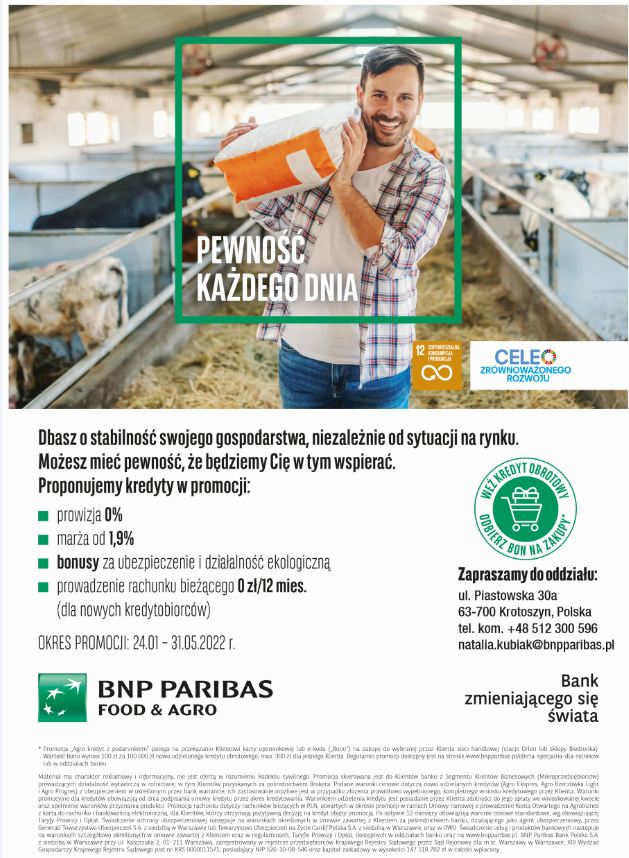 Bank BNP Paribas jakiś czas temu ruszył z kolejną kampanią promocyjną dla rolników pod hasłem „Pewność każdego dnia”. Dzięki kredytom na specjalnych warunkach, możliwe jest finansowanie zakupu środków do produkcji rolnej, inwestycje w ziemię lub realizacja dowolnego celu związanego z rozwojem gospodarstwa. W ramach Konta Otwartego na Agrobiznes, nowi kredytobiorcy będą mogli przez rok bezpłatnie korzystać z rachunku bieżącego. Co więcej, kredyty obrotowe będą premiowane bonami zakupowymi.