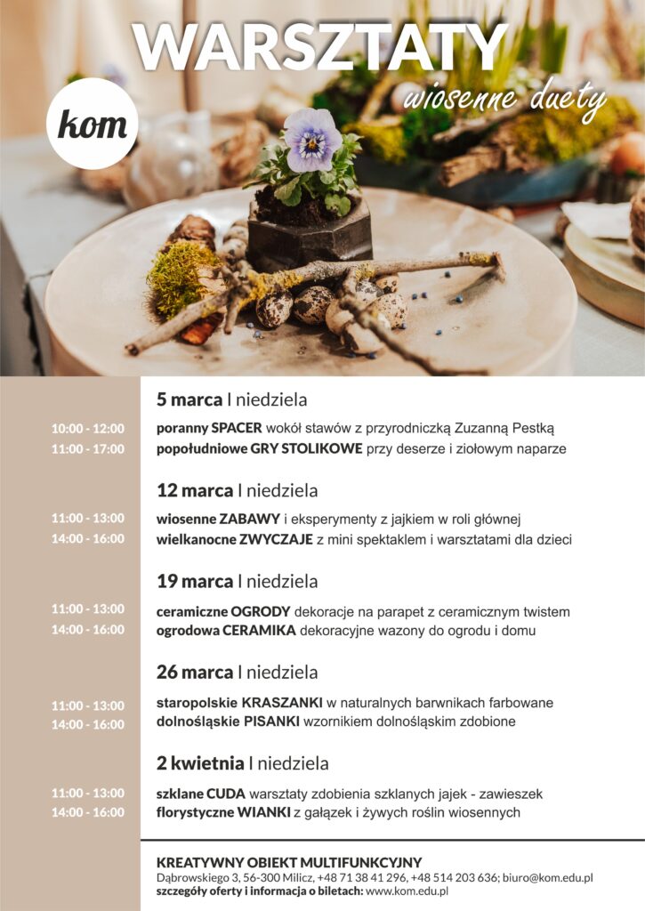 – Muzeum Bombki i Kawiarnia Stara Bombkarnia witają wiosennym stołem – symbolem gościnności i zachowania polskich tradycji, wokół którego już 5 marca rozpoczyna się cykl warsztatów inspirowanych naturą i dolnośląskim folklorem. W każdą niedzielę 05.03- 02.04  będą się odbywały dwa warsztaty – o godz. 11.00 i 14.00. Wyjątkiem jest niedziela, 5 marca, kiedy to na rozgrzewkę proponujemy wiosenny spacer z przyrodniczką Zuzanną Pestką i rodzinne popołudnie z grami planszowymi w KOM. W programie kolejnych warsztatów znajdą się również eksperymenty z jajkiem, wielkanocne zwyczaje i rękodzieło zamknięte w ceramice, czy w kompozycjach kwiatowych. Udział w warsztatach mogą wziąć zarówno dorośli, jak i dzieci – informuje Ewelina Paździor z Kreatywnego Obiektu Multifunkcyjnego.