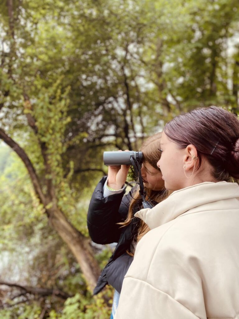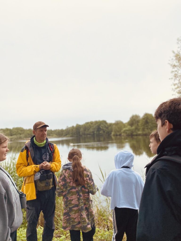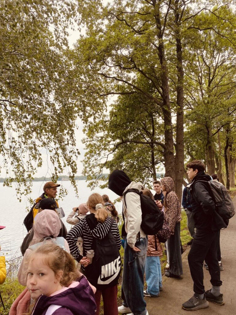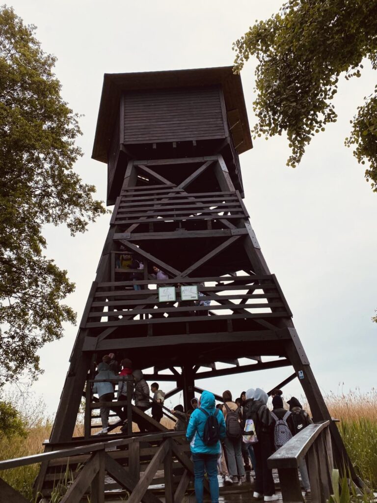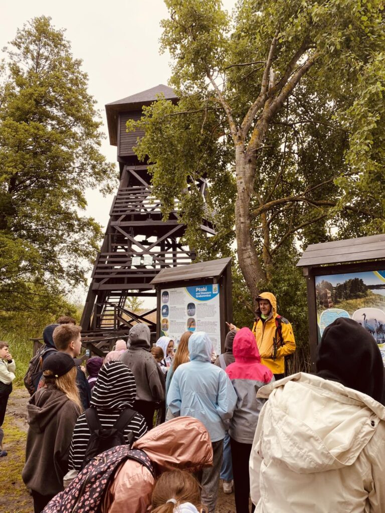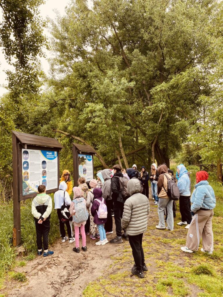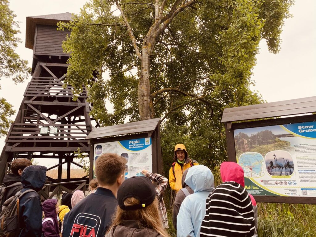 Pierwszym przystankiem była wiata w Grabownicy, gdzie już na początku wyprawy udało się wypatrzyć bielika – prawdziwą gratkę dla miłośników ptaków. Spacerując groblą wokół stawów, uczniowie mieli okazję z bliska obserwować czaple siwe, łabędzie, perkozy czy kormorany. Lornetki i ciekawe opowieści prowadzącego warsztaty pana Macieja Kowalskiego pozwoliły odkryć, jak ważną rolę pełnią stawy jako miejsca lęgowe i żerowiska dla ptactwa.