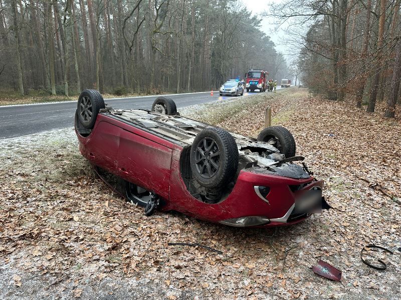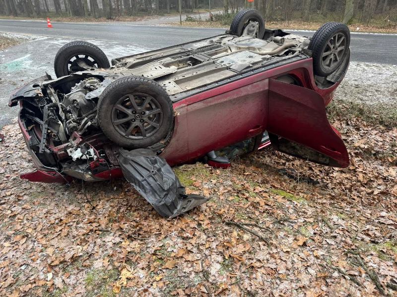 Na oblodzonej drodze między Godnową a Stawczykiem doszło do groźnie wyglądającej kolizji z udziałem ciężarówki i samochodu osobowego. Mazda wypadła z jezdni i przewróciła się na dach, jednak – jak ustalono – nikt nie odniósł poważnych obrażeń.