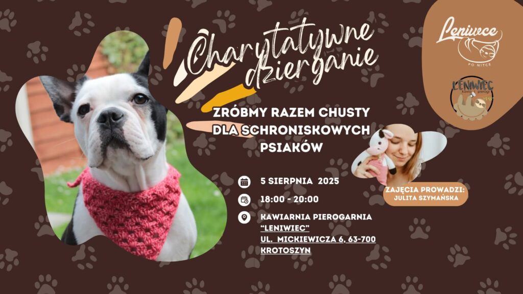 5 sierpnia w godzinach 18.00-20.00 w klimatycznej kawiarni-pierogarni Leniwiec przy ul. Mickiewicza 6 w Krotoszynie odbędzie się wyjątkowe wydarzenie – „Charytatywne dzierganie”. Będzie to okazja, aby nauczyć się czegoś nowego, a jednocześnie pomóc pieskom z Krotoszyna.