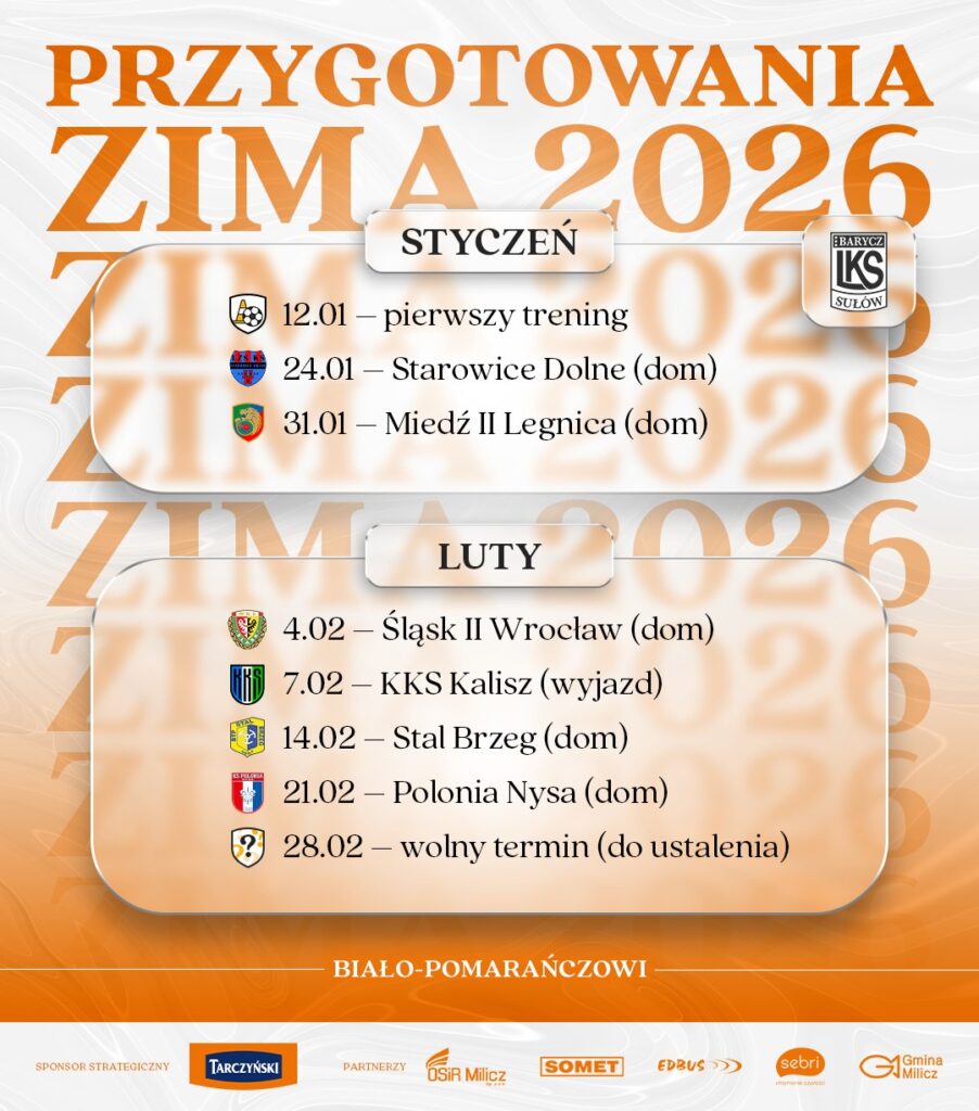 Z punktu widzenia kibiców istotna informacja jest taka, że pięć meczów kontrolnych odbędzie się na obiektach w Sułowie. Harmonogram sparingów przedstawia się następująco: